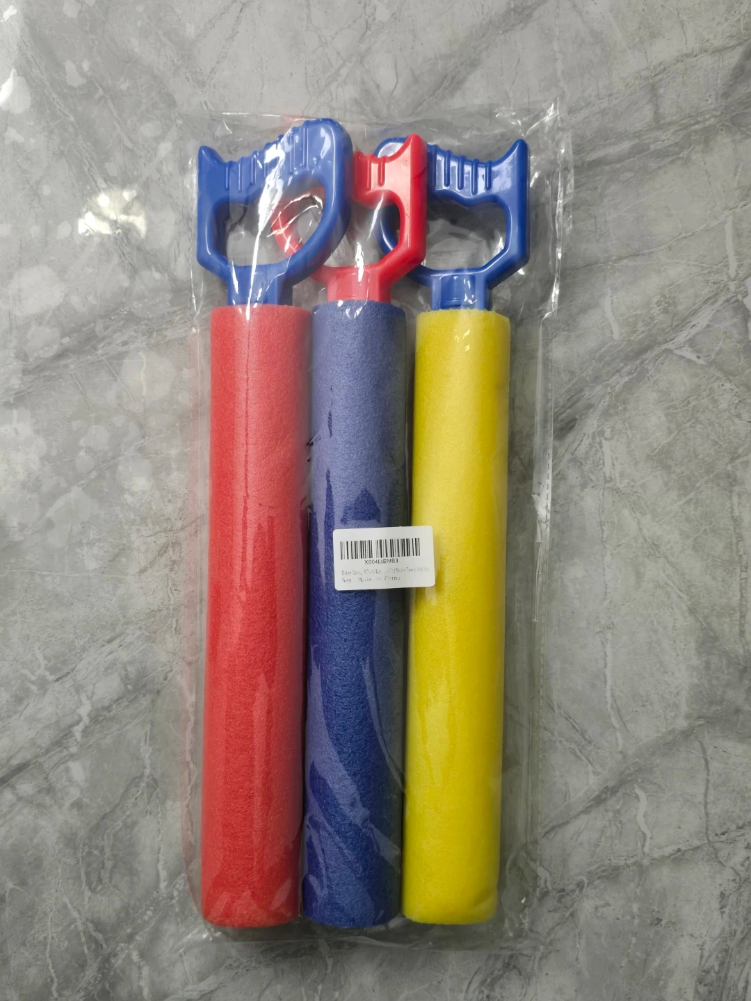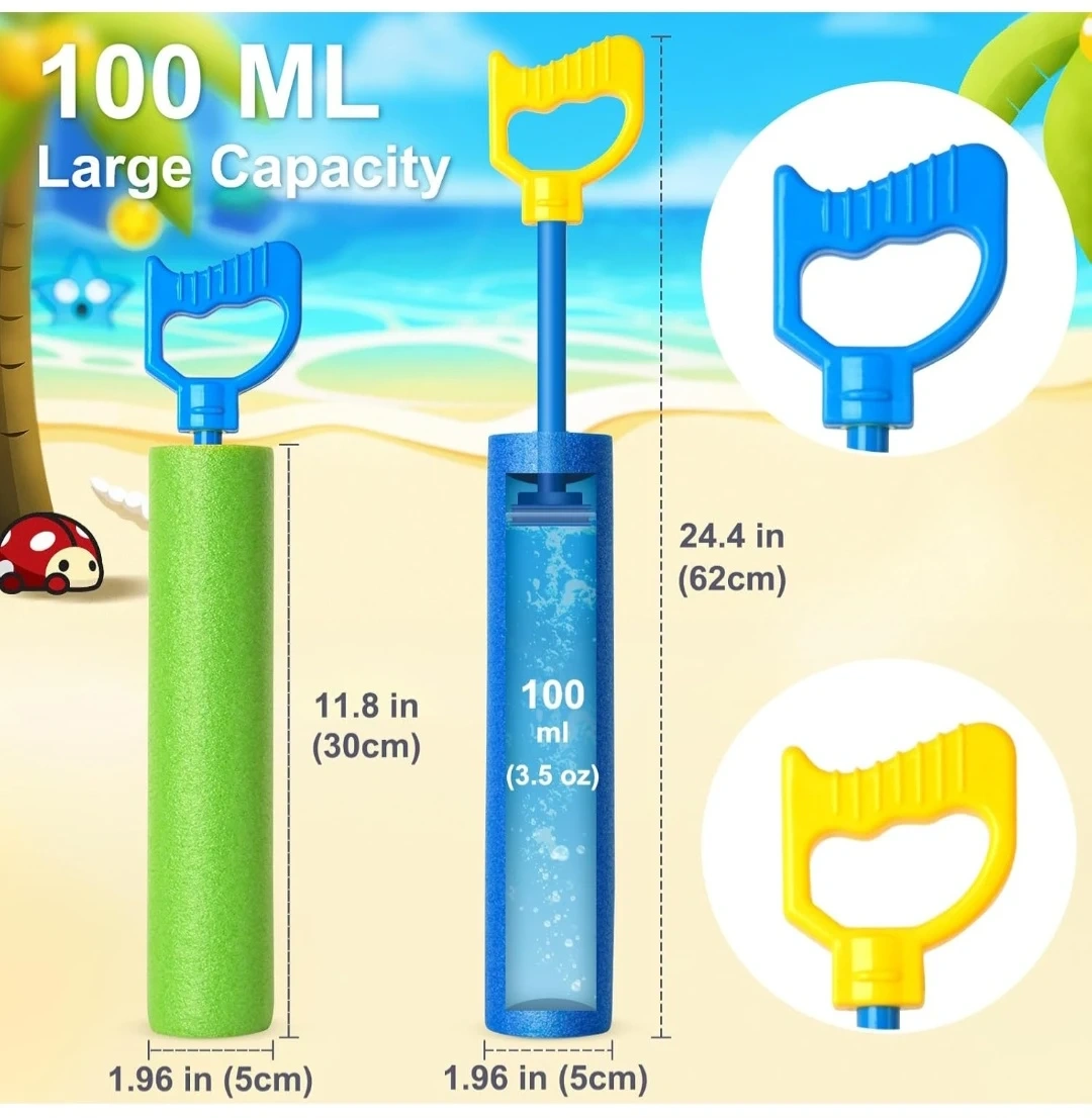 This is a set of three foam water guns with large 100 ML capacity. Each water gun measures 11.8 inches (30cm) long and 1.96 inches (5cm) in diameter. They feature an ergonomic handle and are made from eco-friendly soft foam. These water guns shoot up to 40ft, making them great for backyard fun or trips to the pool or beach!