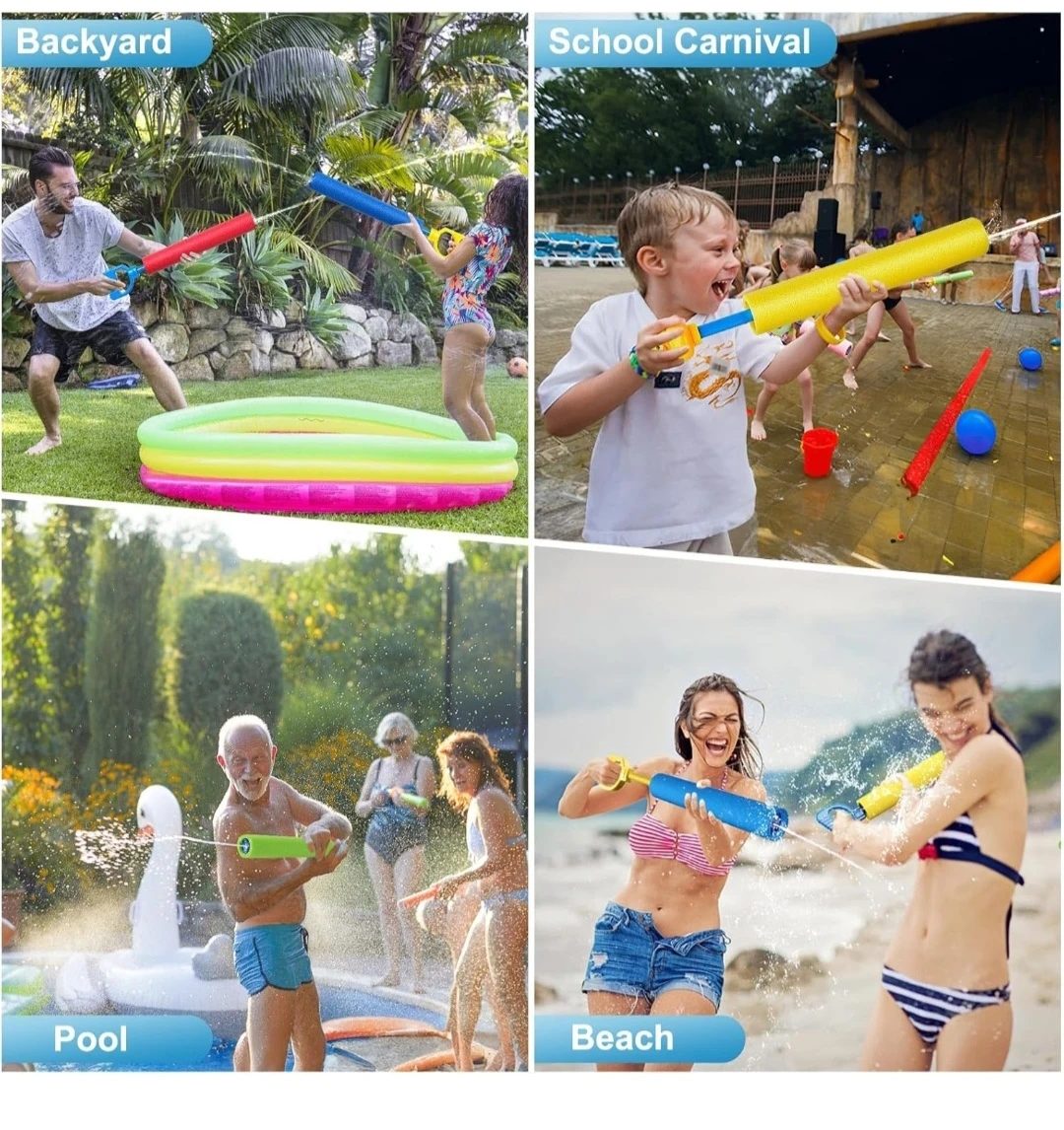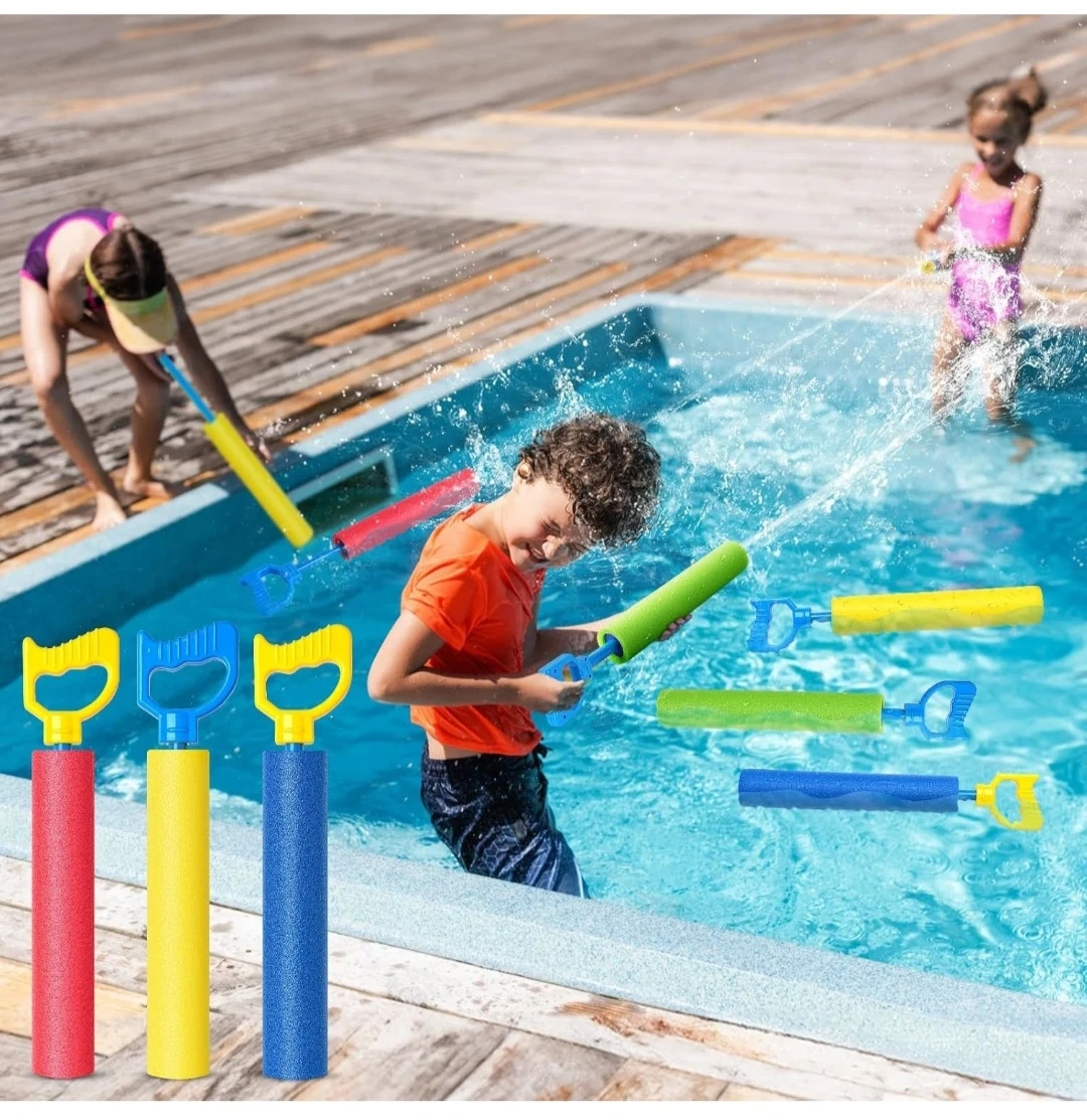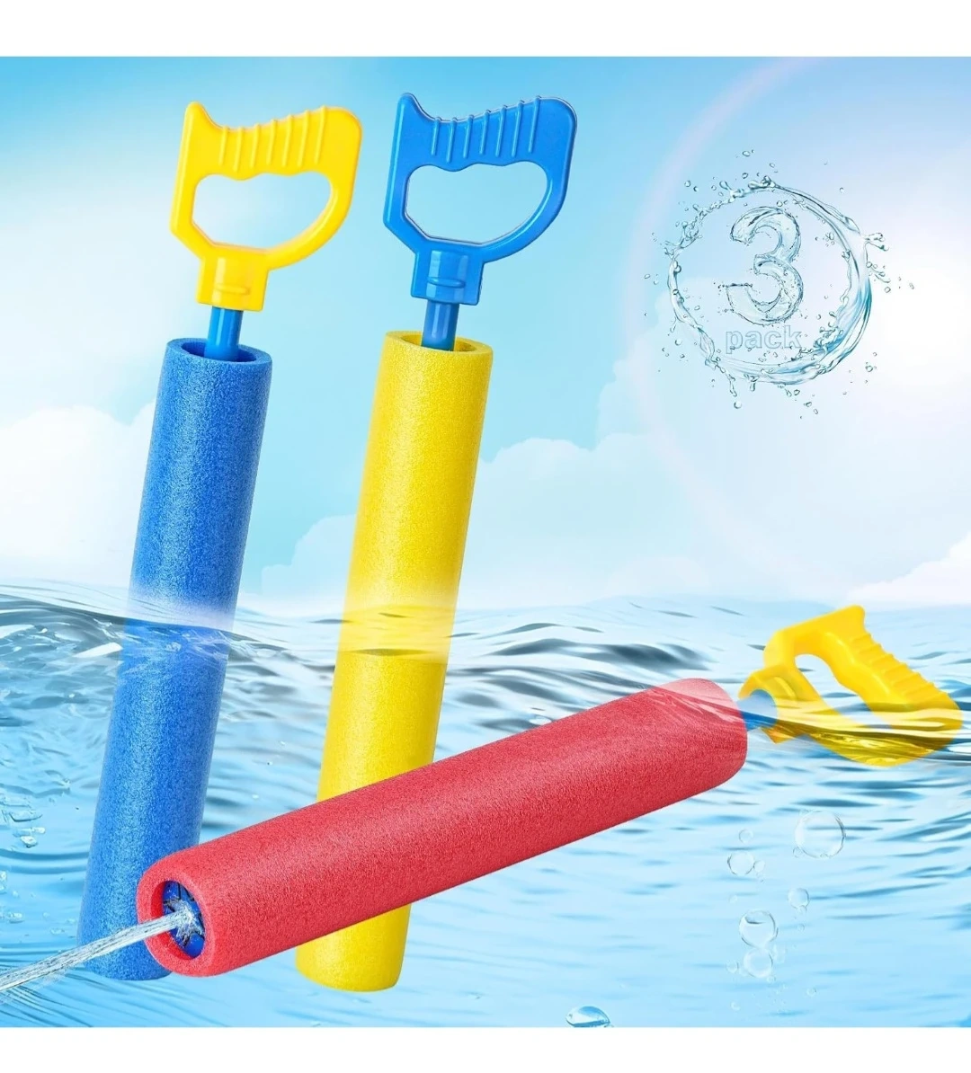 This is a set of three foam water guns with large 100 ML capacity. Each water gun measures 11.8 inches (30cm) long and 1.96 inches (5cm) in diameter. They feature an ergonomic handle and are made from eco-friendly soft foam. These water guns shoot up to 40ft, making them great for backyard fun or trips to the pool or beach!