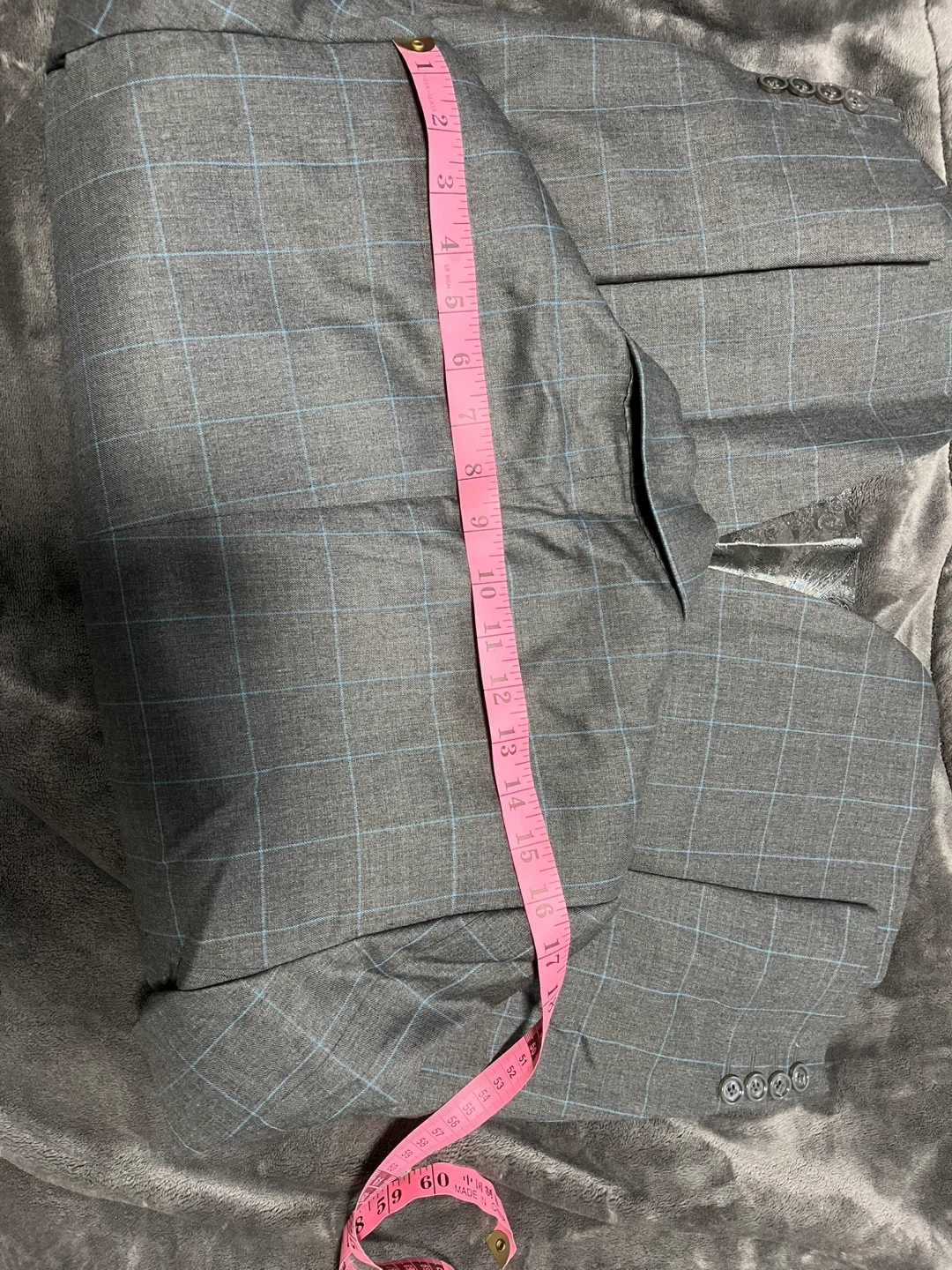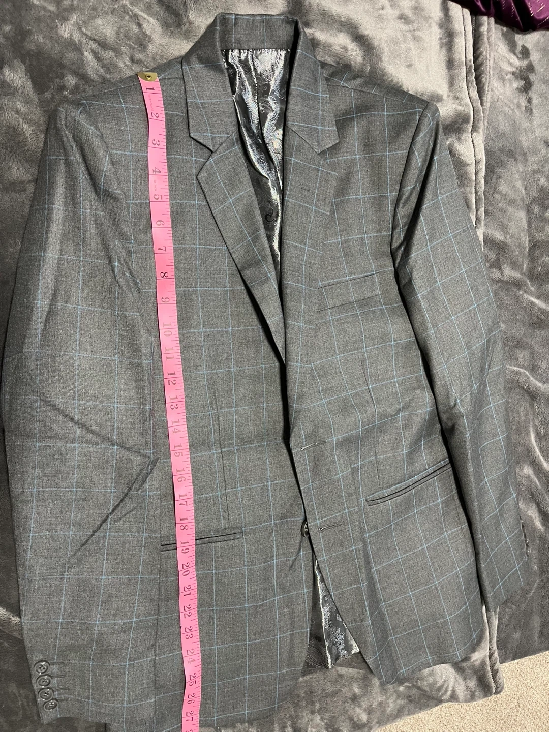 Grey blazer with a blue plaid pattern. It has a satin-lined interior. Button closure at the front. Sleeve length is approximately 25 inches.