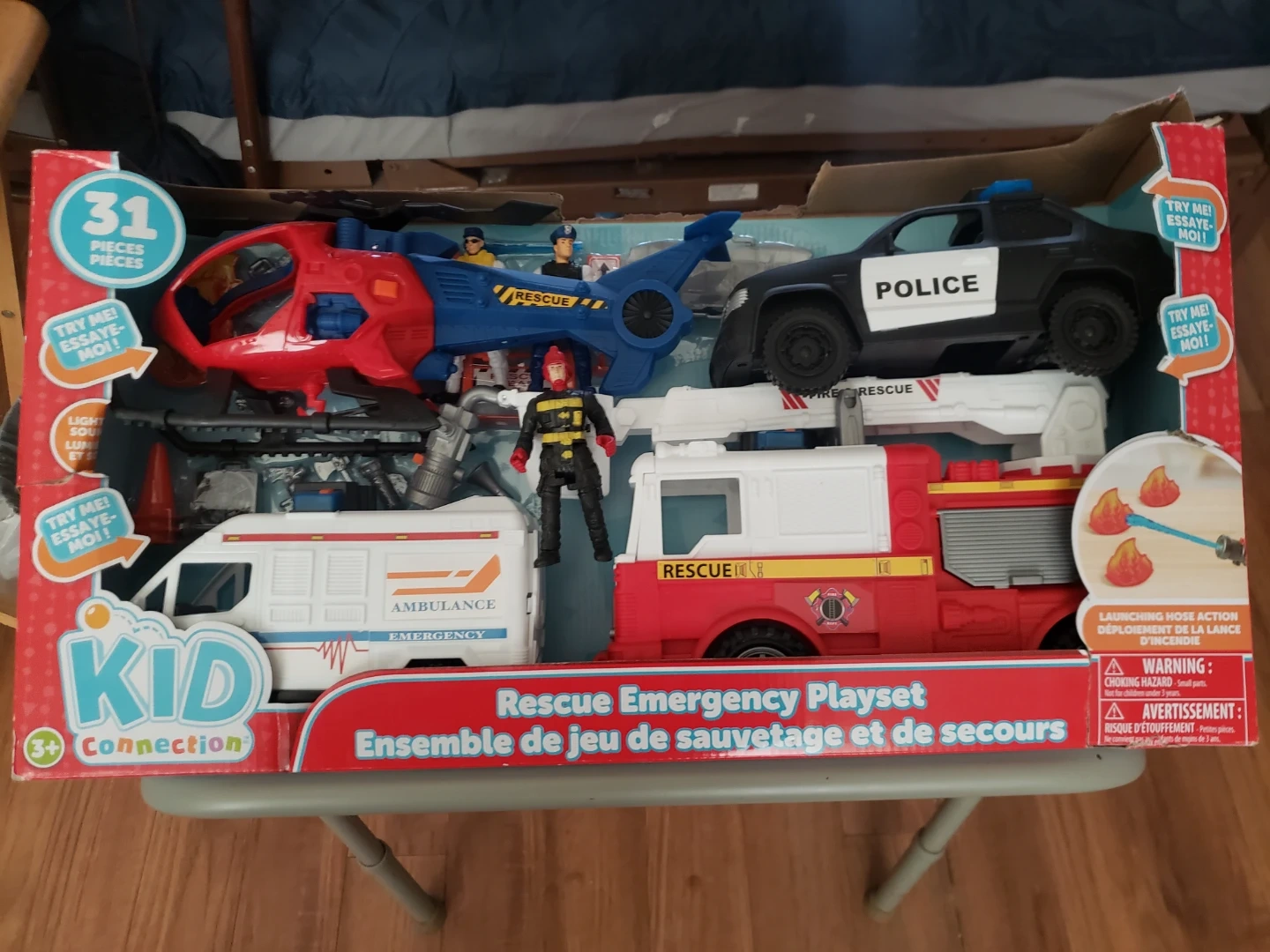 This Kid Connection Rescue Emergency Playset includes a police car, ambulance, helicopter, and fire truck. It has 31 pieces and features launching hose action. Suitable for ages 3 and up.