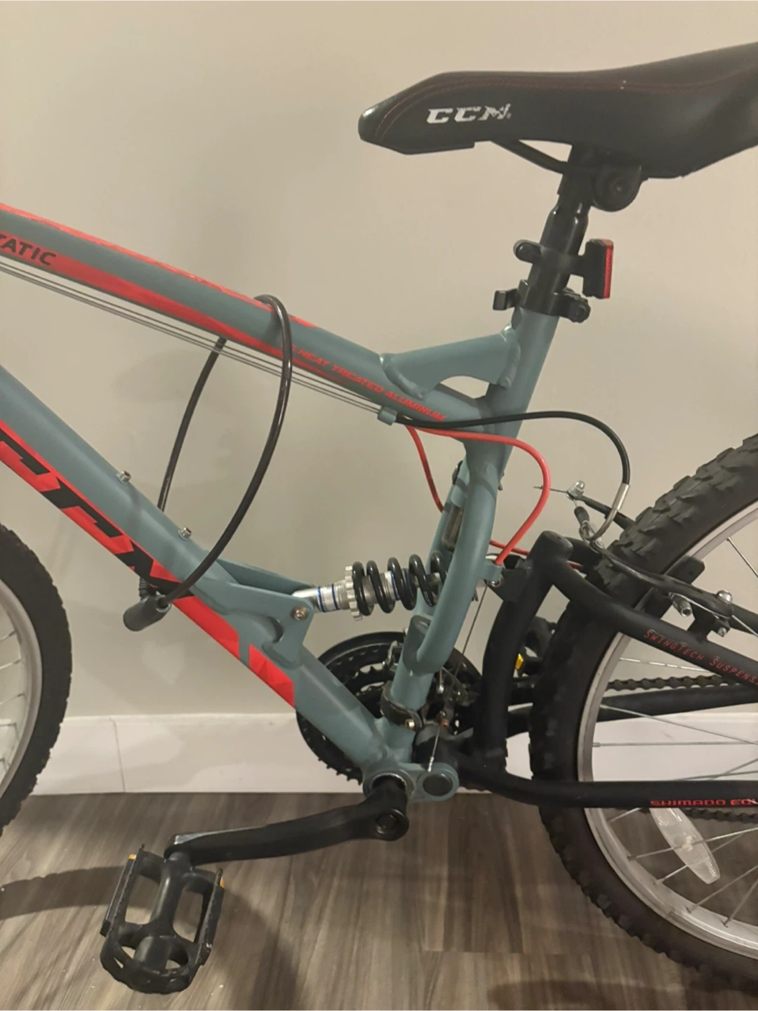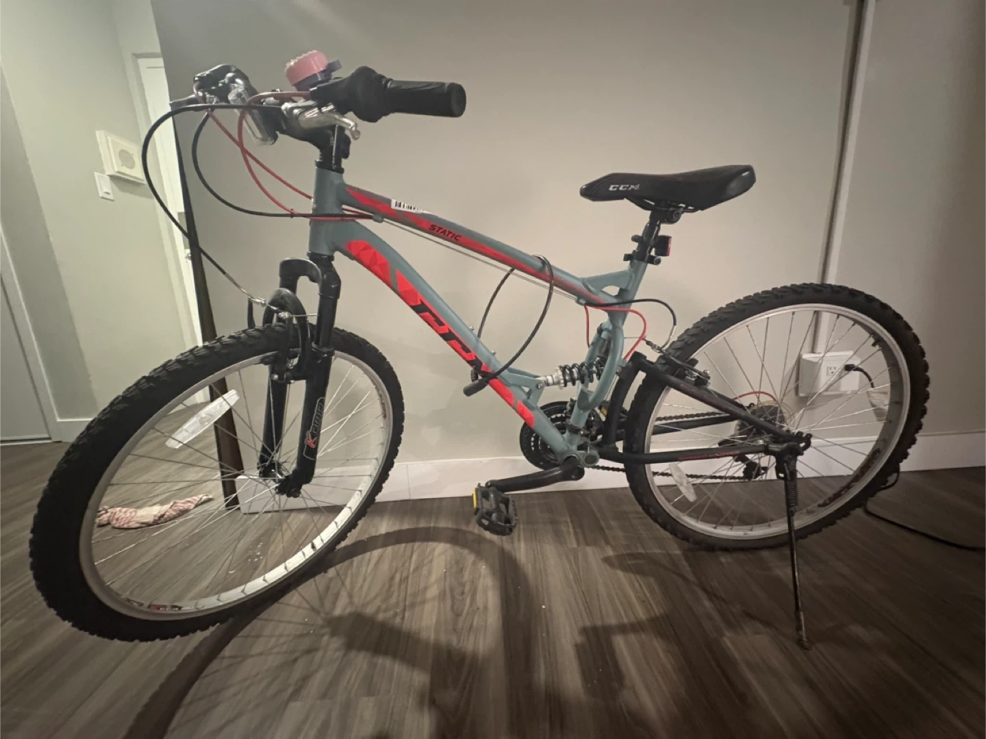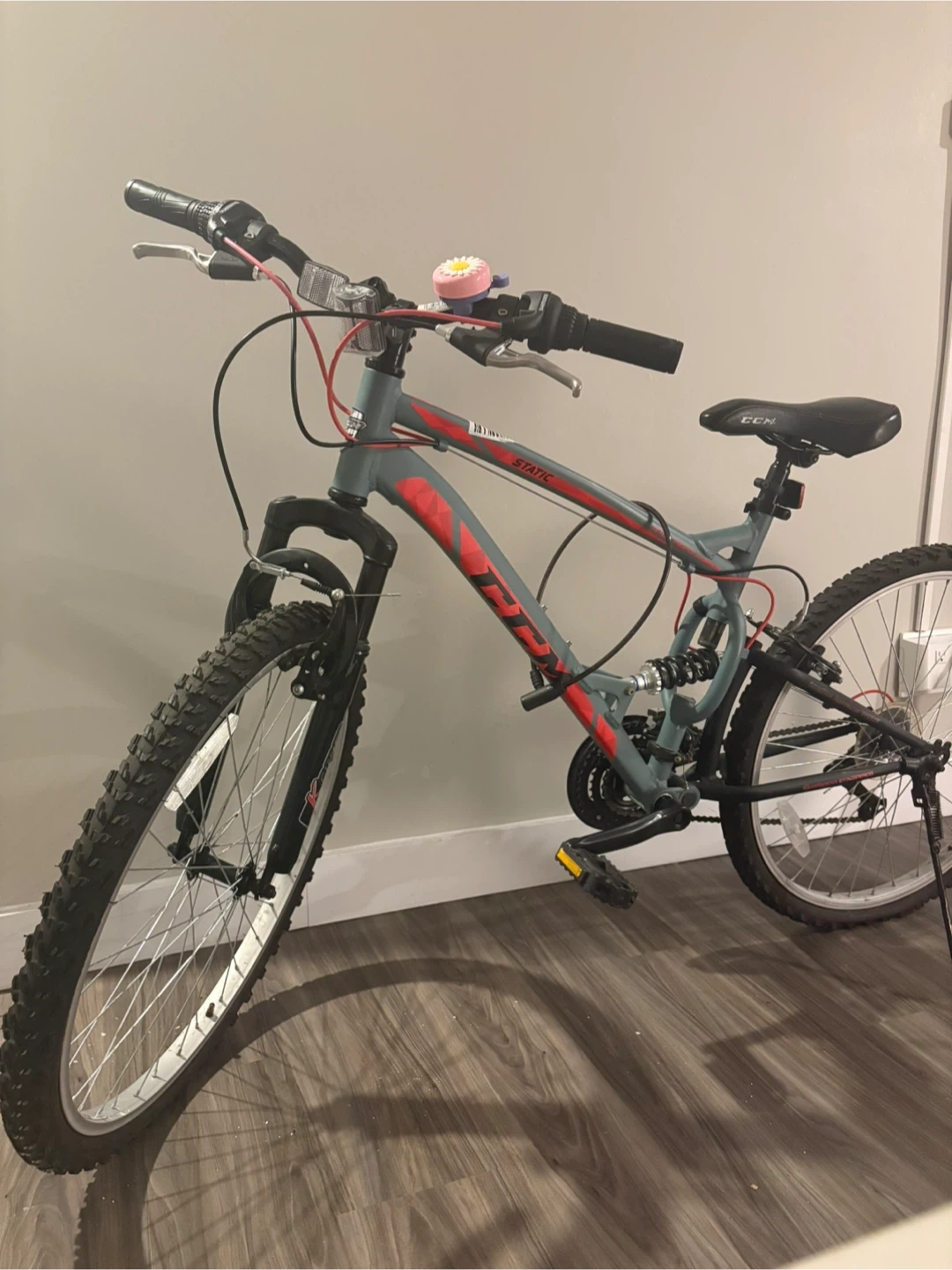 CCM "STATIC" mountain bike with full suspension. Features Shimano gears and disc brakes. Comes with lock!