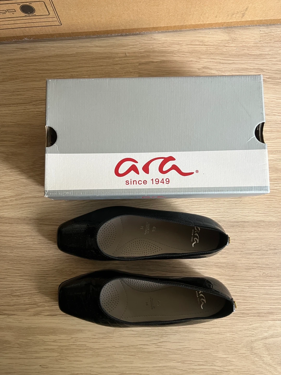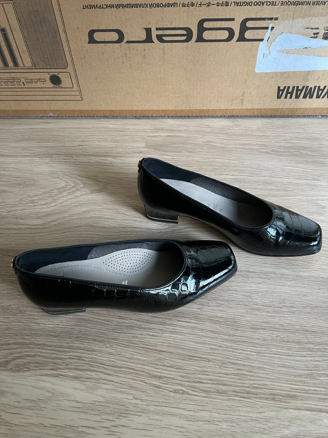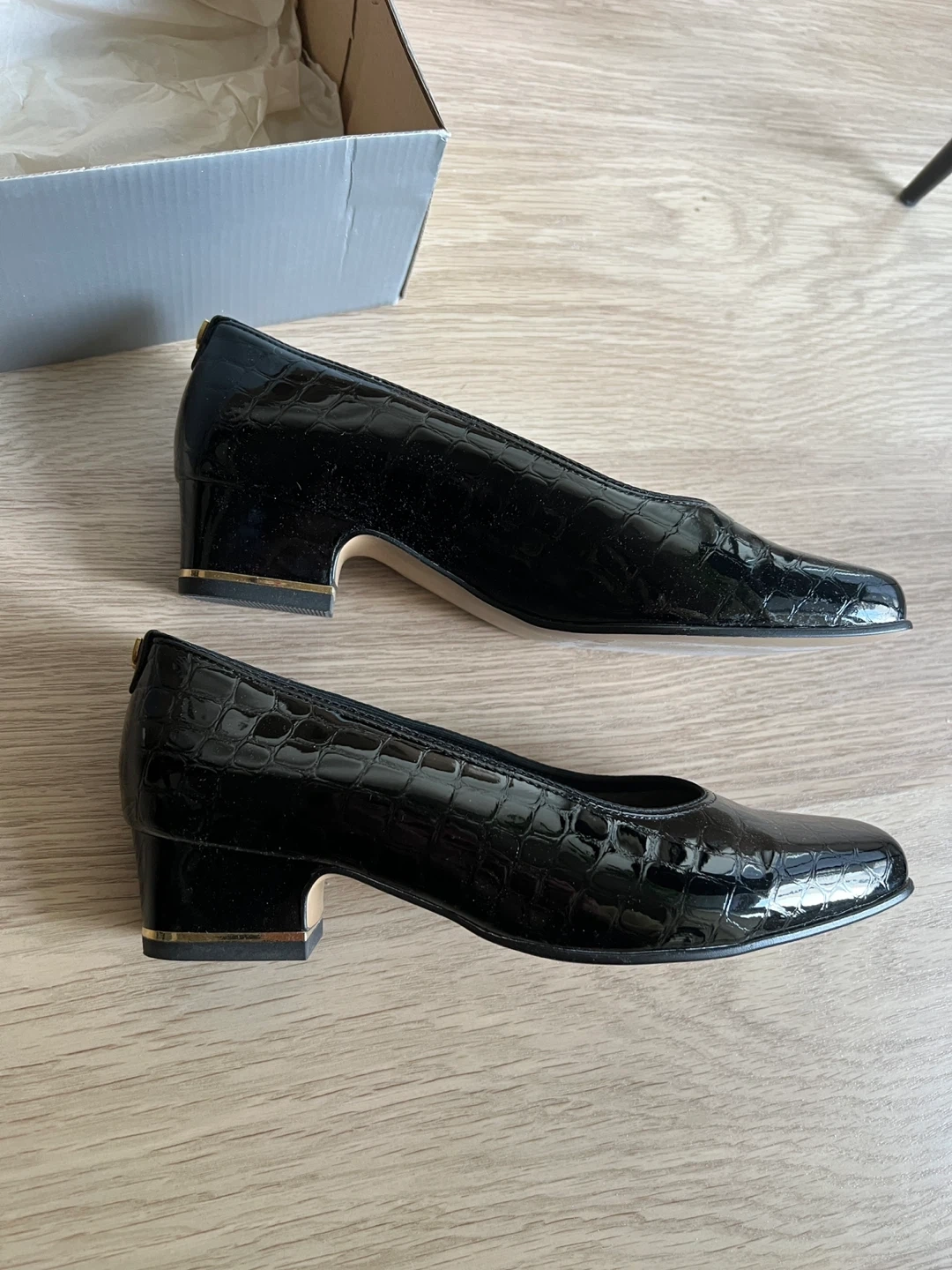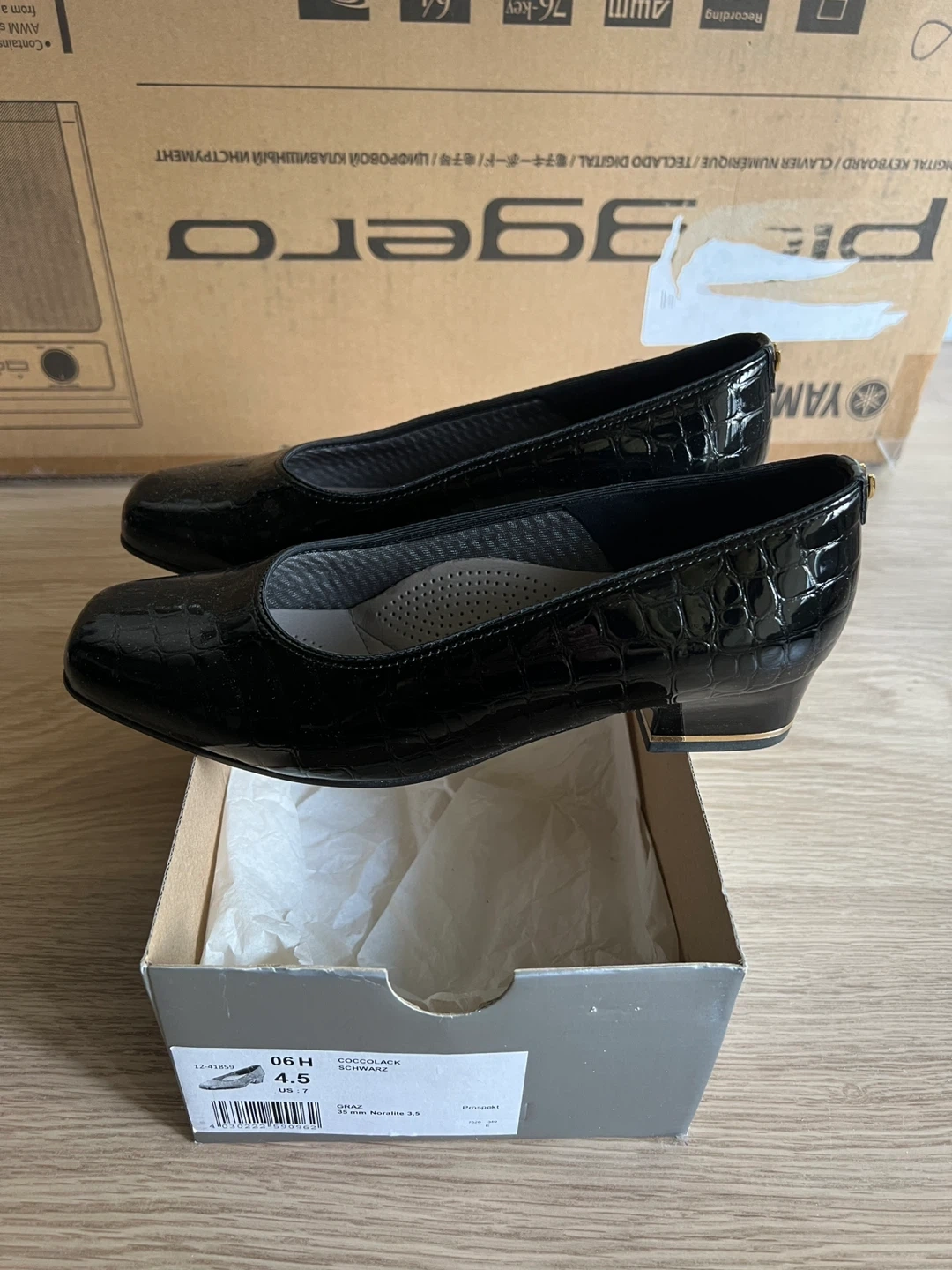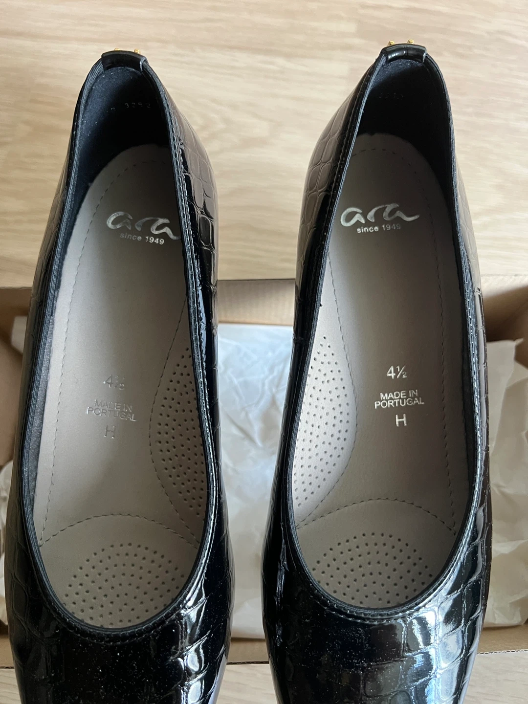 Ara black patent leather short block heels with a croc embossed finish. Nice gold touches on them. They are size 7. They come with the original box. Purchased from a Walking on a cloud shoe store. Ara is a long established German comfort shoe brand. Worn twice. Made in Portugal.