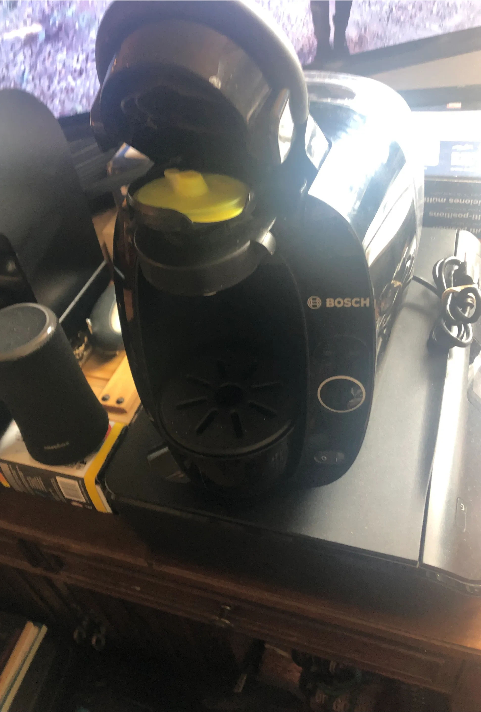This is a black Bosch Tassimo coffee maker. It's a compact machine, perfect for making single servings of coffee. Black plastic construction.