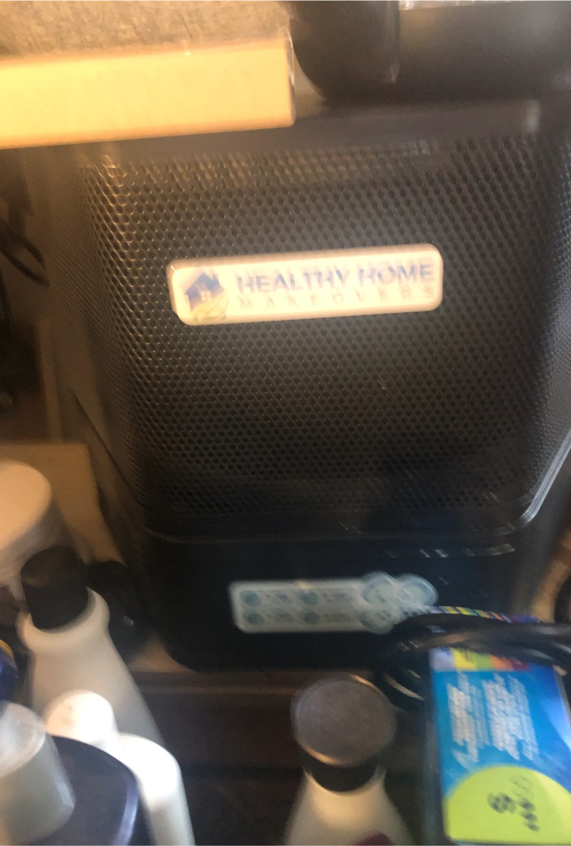 This is a Healthy Home air purifier. It features a compact design and a black mesh grille. The unit is in good working order. Perfect for small spaces or a home office!