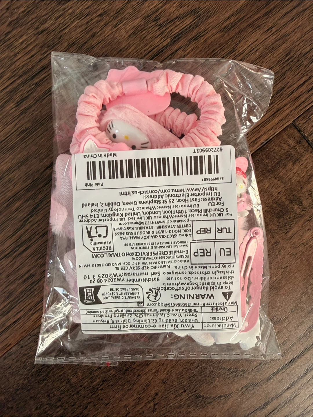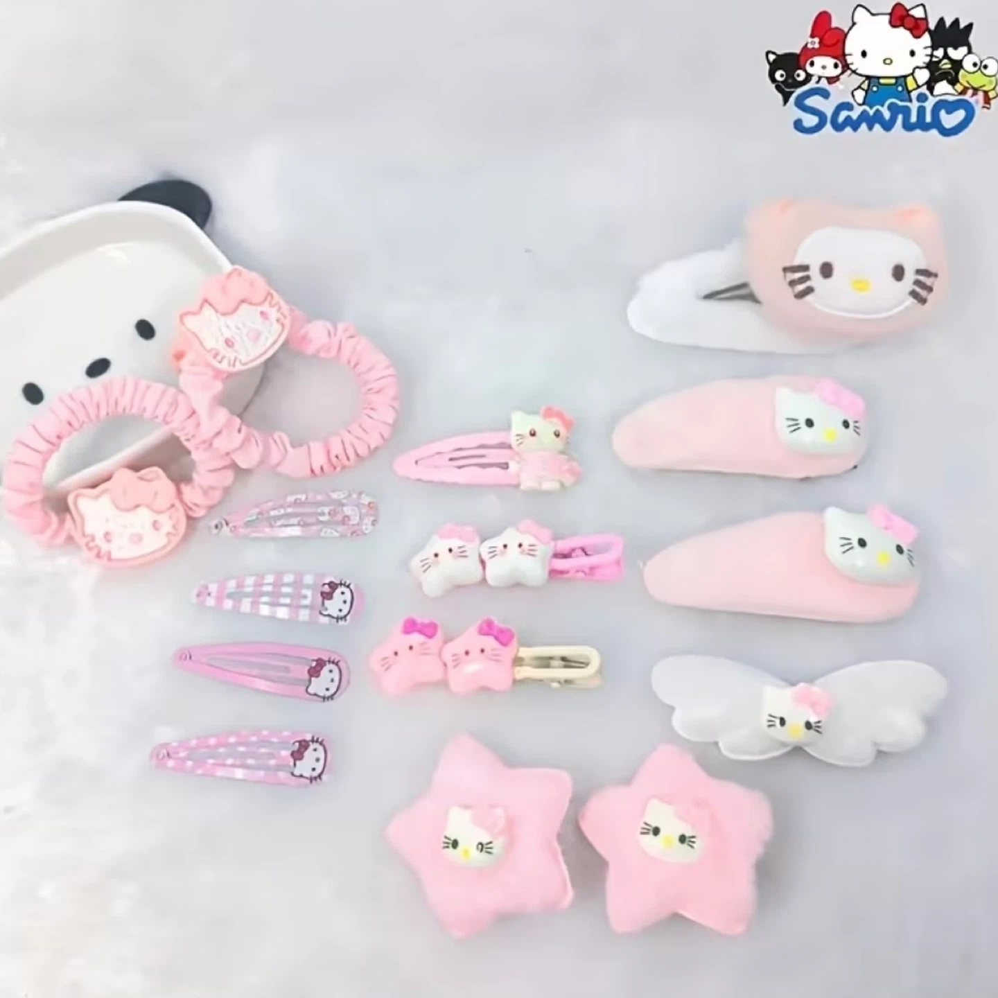 This set includes 15 pieces of pink Hello Kitty themed hair accessories like scrunchies and hair clips. It's perfect for adding a touch of cute to any hairstyle. These accessories are made with soft, fuzzy materials and come in different cute designs.