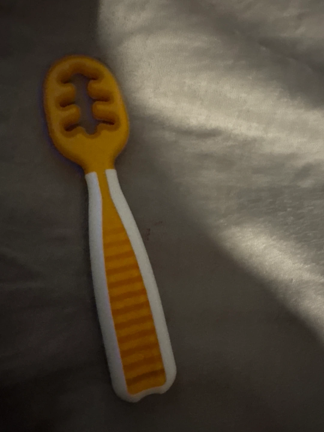 This is a yellow and white baby teether spoon. It's made of plastic and has a textured handle. It's a great tool for babies starting solids! This came in a pack of three which is too many, and this was never used.