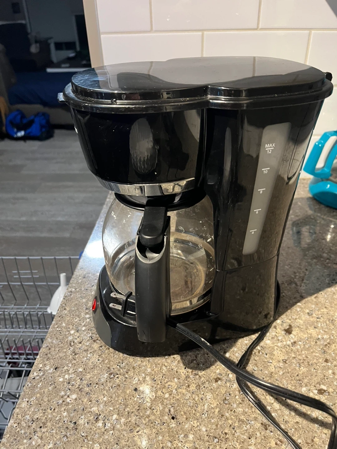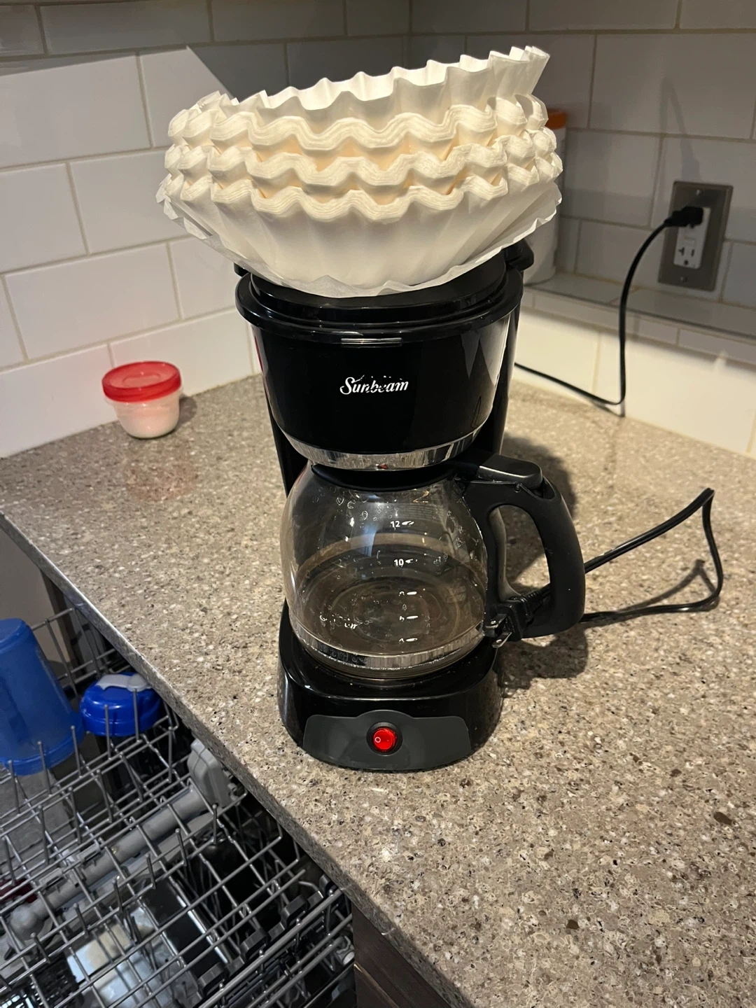This is a black Sunbeam 12-cup coffee maker. It has a glass carafe and a red power button. It's perfect for making your morning coffee.