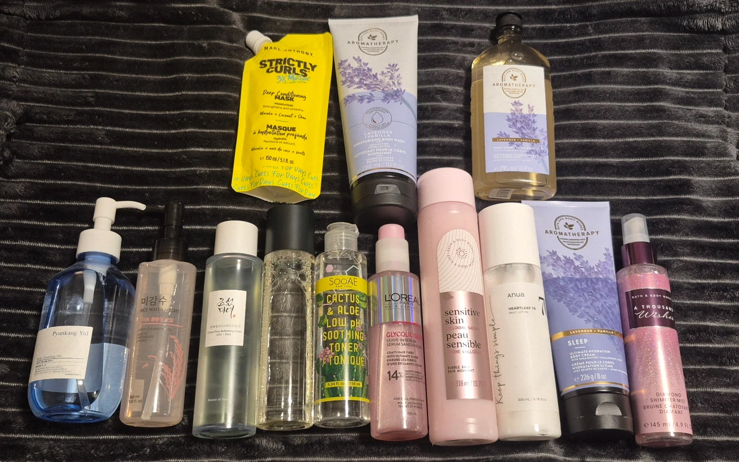 Bottom row (opened and gently used, should be used within 6 months of picking up items from me): Pyunkang Yul Deep cleansing oil, The Face Shop rice water bright cleansing oil, Beauty of Joseon green plum toner, Pyunkang Yul calming toner, Loreal Paris Gylcolic Gloss. Bath and Body Works Sensitive Skin bubble bath, Anua Heartlleaf 70 daily lotion, Bath and Body Works Lavender vanilla cream, Bath and Body Works A Thousand Wishes shimmer mist. SOOAE Cactus Aloe toner.