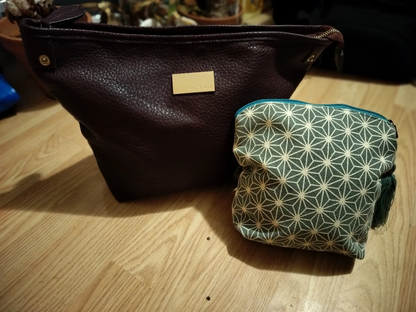 This set includes a burgundy faux leather bag with a gold accent plate. Zipper works great. Size: ~12"*10"*3"