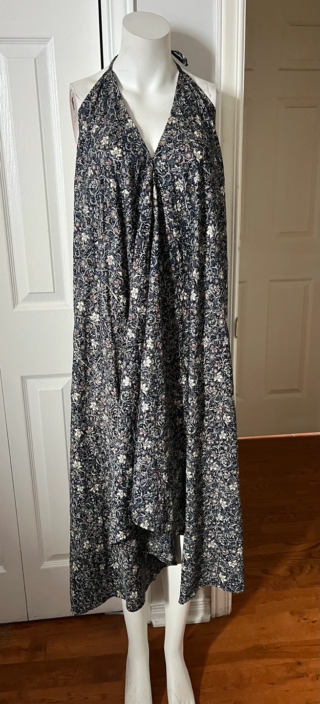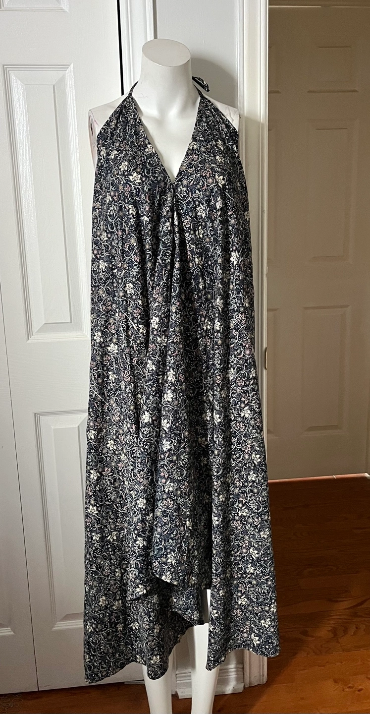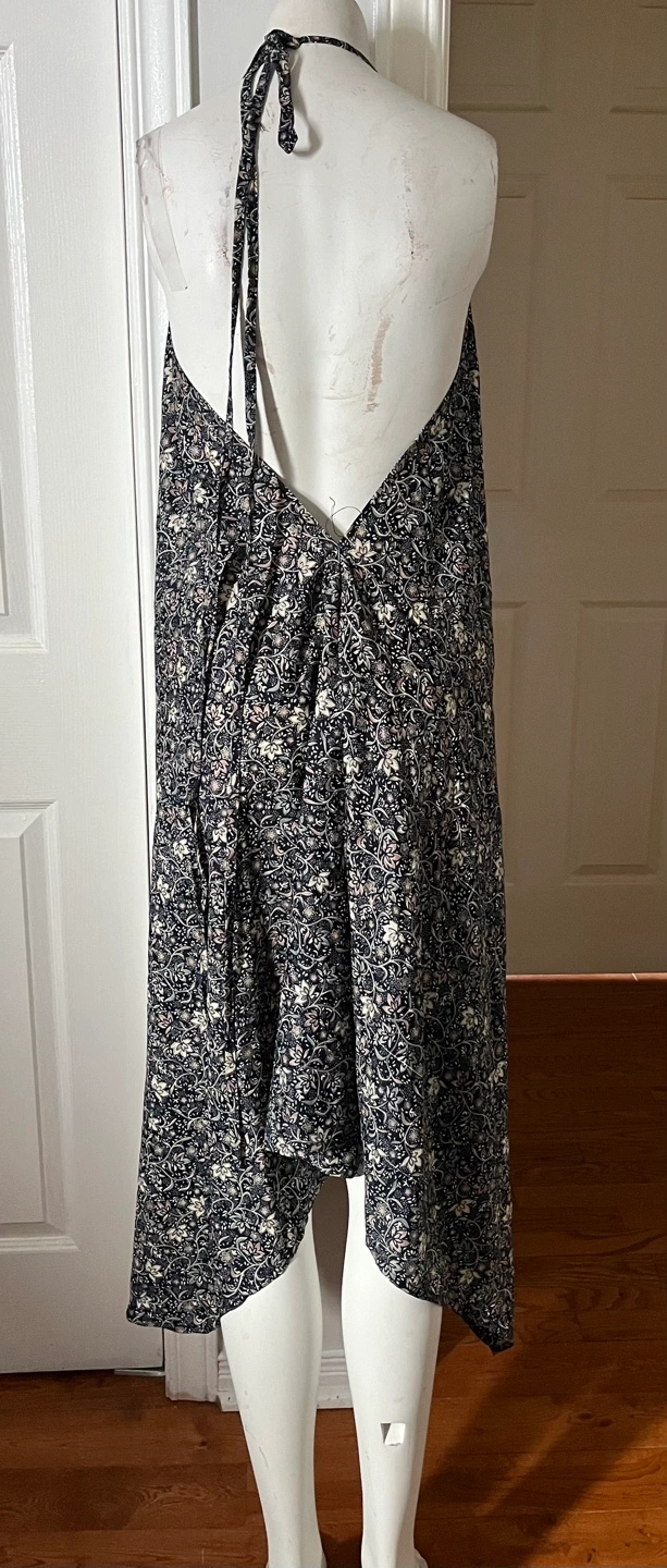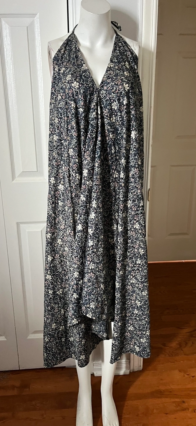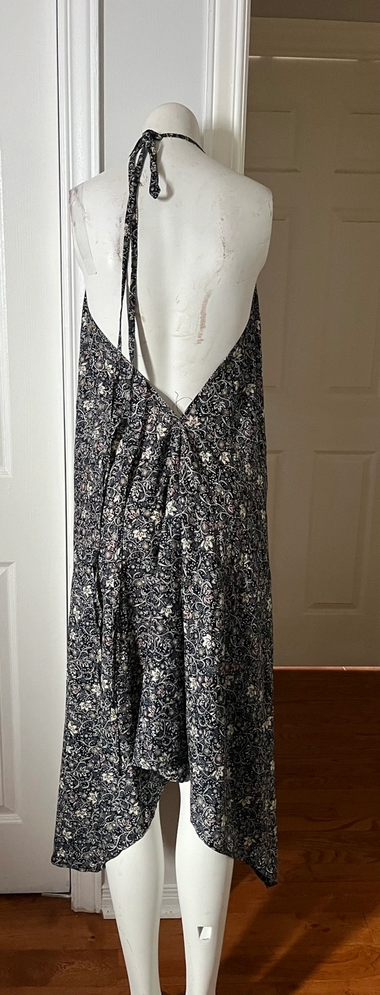 Flowy halter maxi dress with a dark floral print. It features a flattering V-neck and a handkerchief hemline. This dress is perfect for a warm summer day or a casual outing!