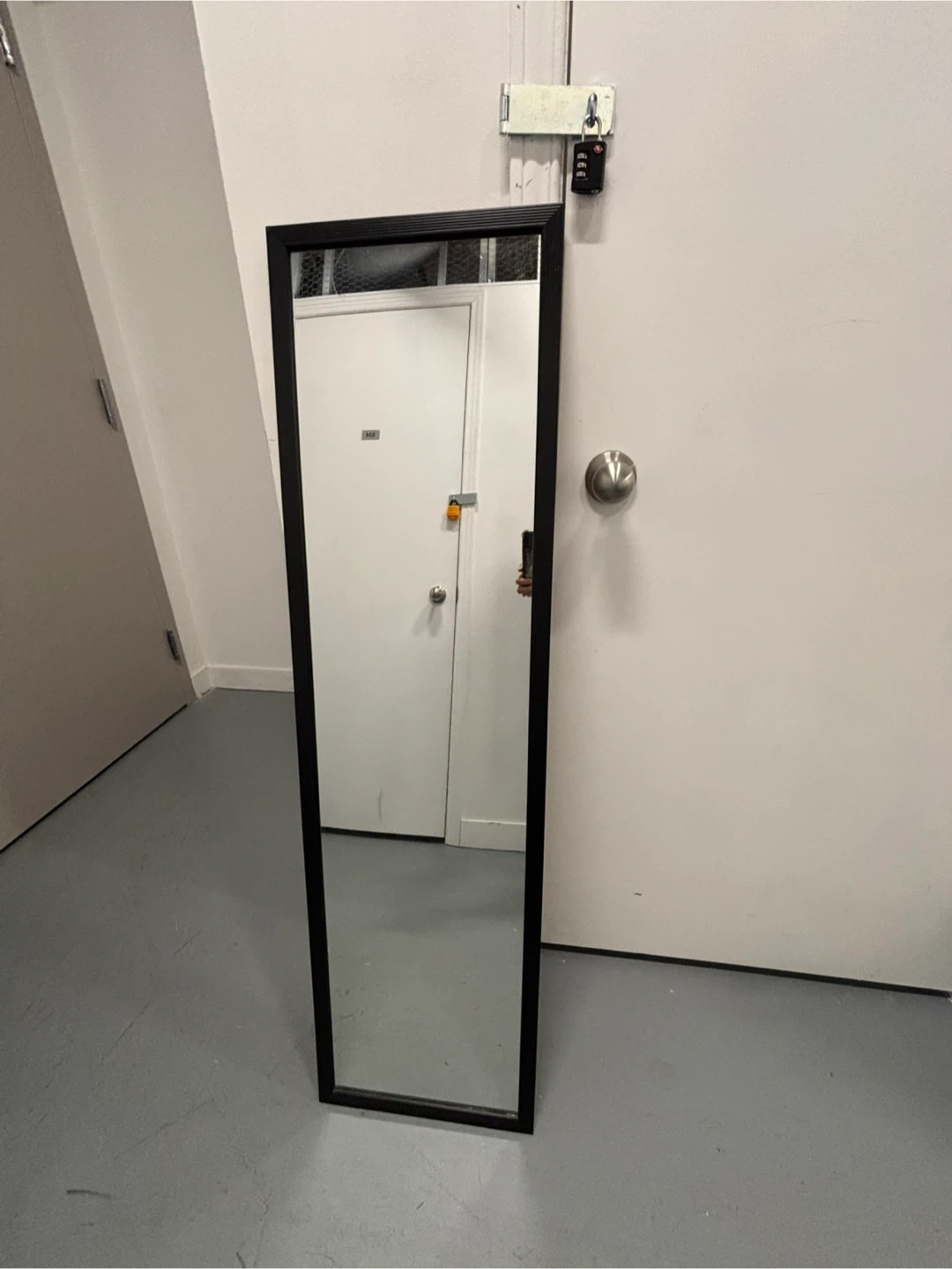 This is a sleek, full-length mirror with a black frame. It's tall enough to see your entire outfit. Perfect for getting ready in the morning or checking your look before heading out!