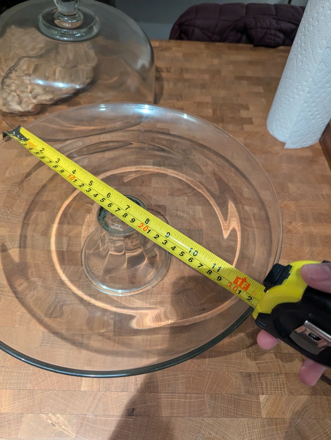 A clear glass cake stand complete with a matching dome lid. It's perfect for displaying and keeping baked goods fresh. The stand measures 12 inches in diameter.