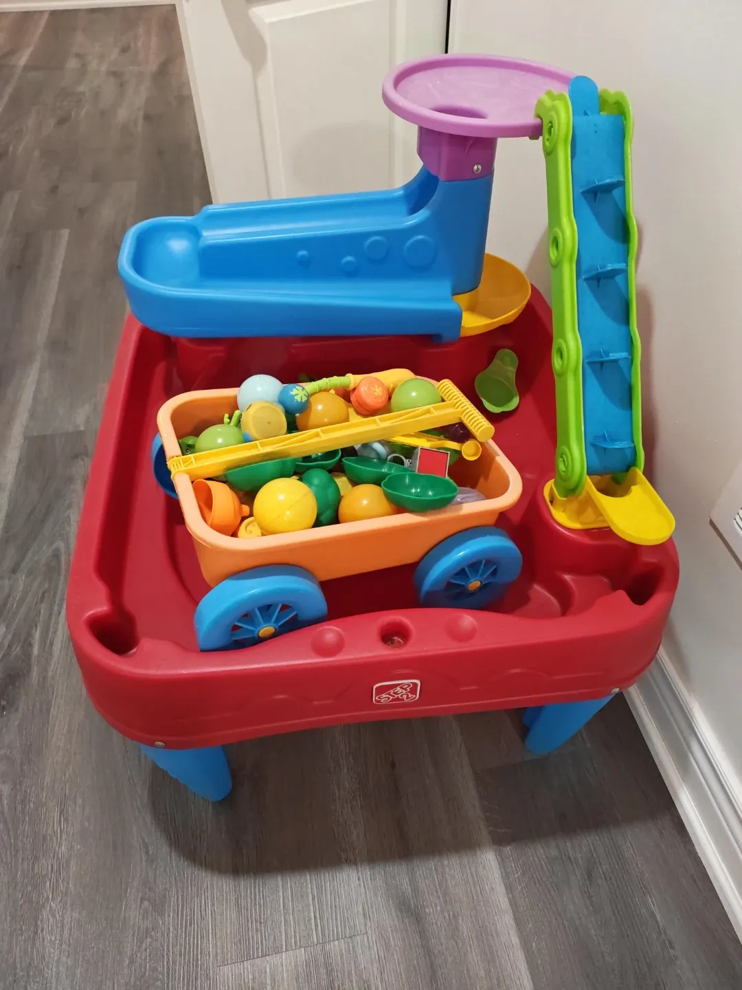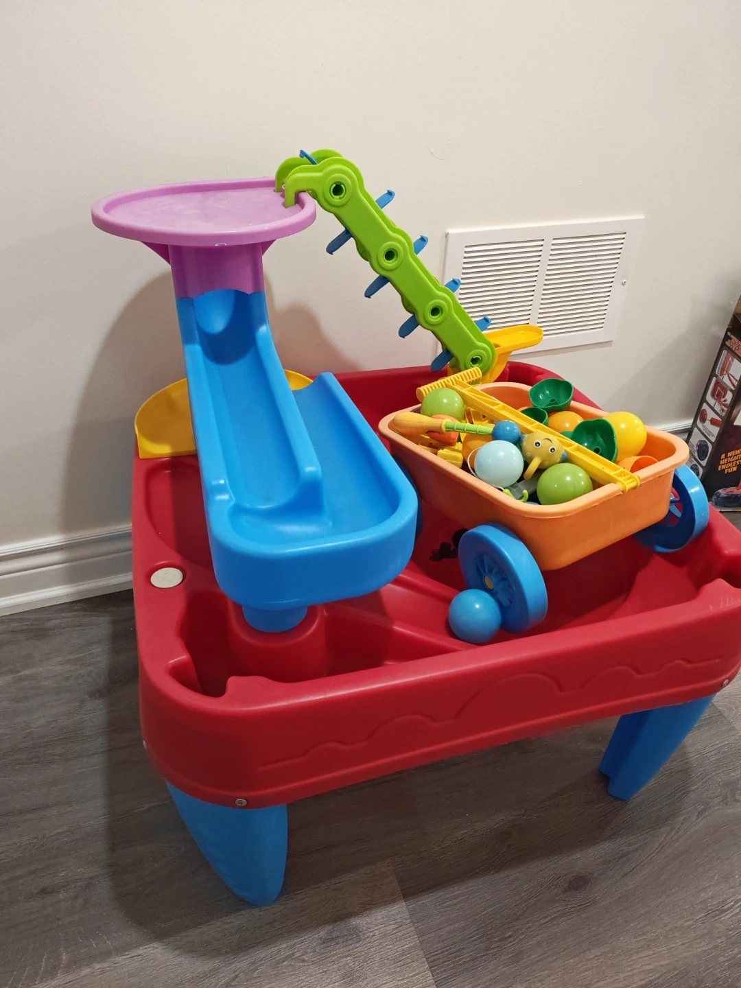 This Step2 water table is great for outdoor play. It includes a fun water slide and a wagon filled with accessories. It's perfect for keeping little ones entertained on a warm day!