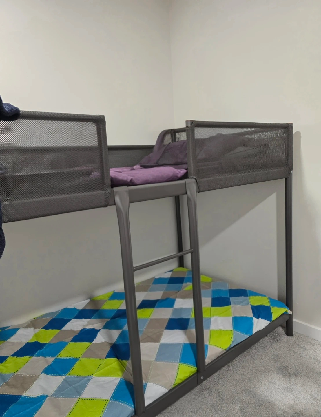 This is a grey IKEA bunk bed.It's great for maximizing space in a room!