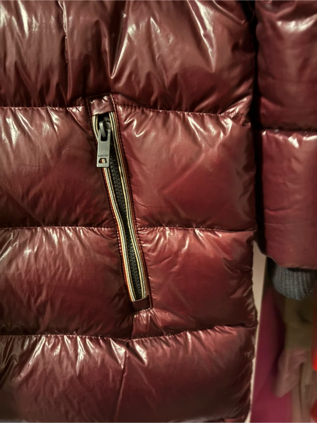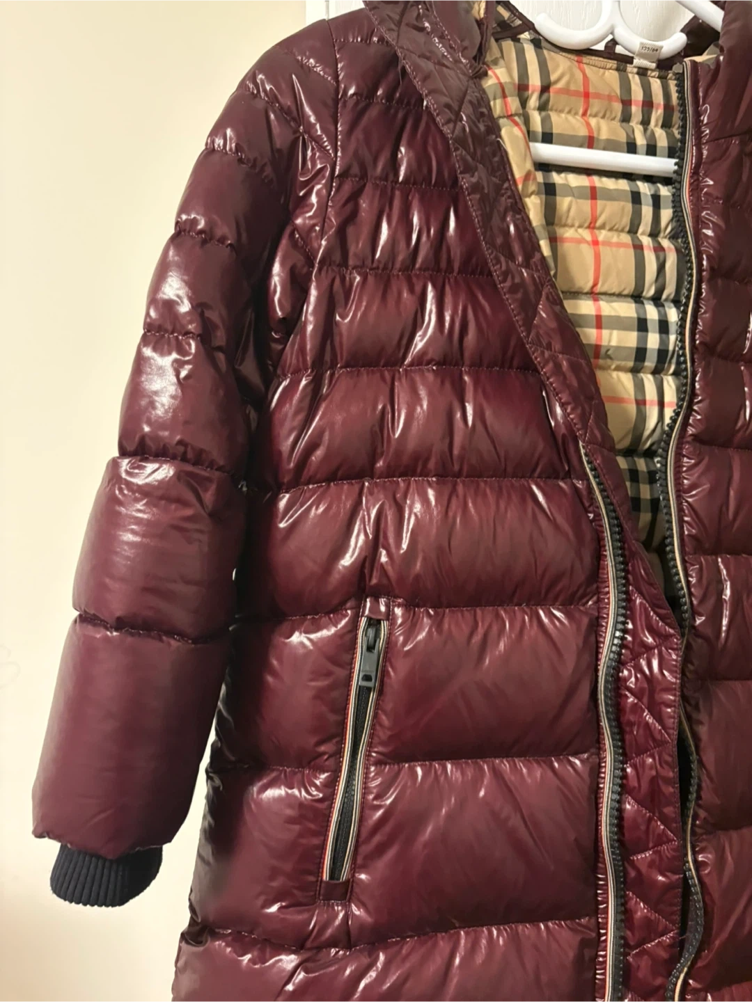 Burberry puffer jacket in burgundy with signature Nova Check lining. It's a reversible jacket, size 128cm. The outer shell is a glossy, water-resistant material. It comes with a hood.