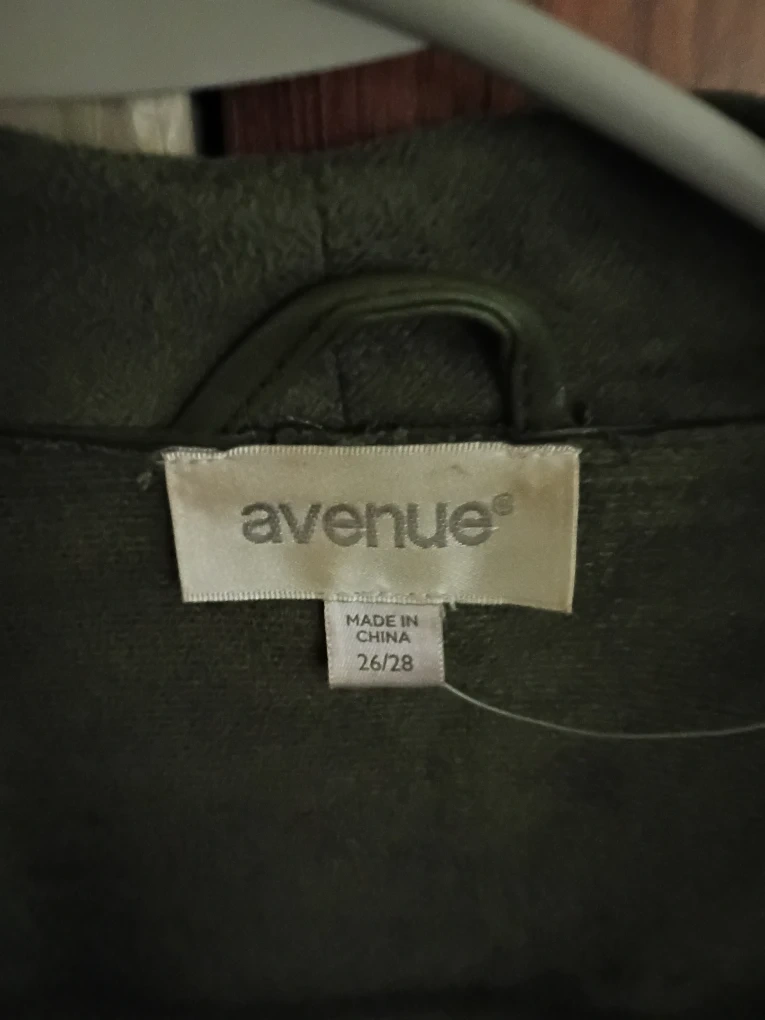 This Avenue jacket is in a beautiful olive green color. It features a stylish waterfall front and zippered pockets. Made in China, size 26/28. It's a great layering piece for any wardrobe!
