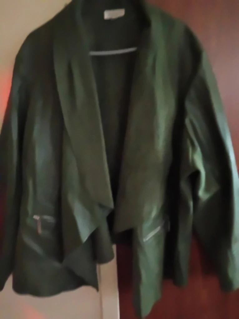 This Avenue jacket is in a beautiful olive green color. It features a stylish waterfall front and zippered pockets. Made in China, size 26/28. It's a great layering piece for any wardrobe!