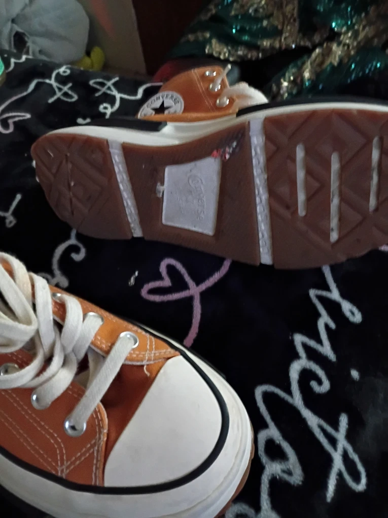 These are Converse high top sneakers in a vibrant orange color. They feature classic lace-up closure and a durable rubber sole. The canvas upper is comfortable for everyday wear. A great addition to any casual wardrobe!