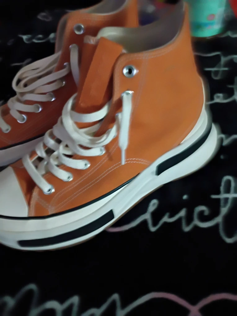 These are Converse high top sneakers in a vibrant orange color. They feature classic lace-up closure and a durable rubber sole. The canvas upper is comfortable for everyday wear. A great addition to any casual wardrobe!