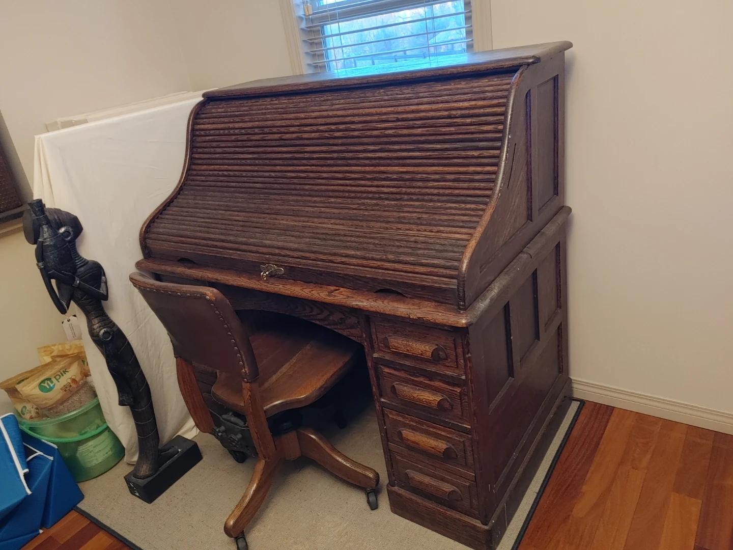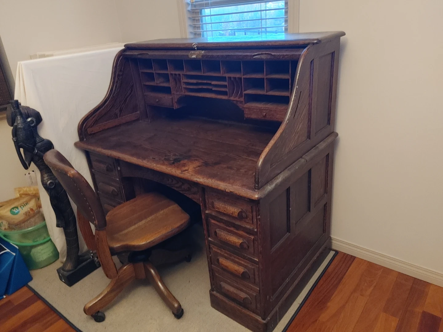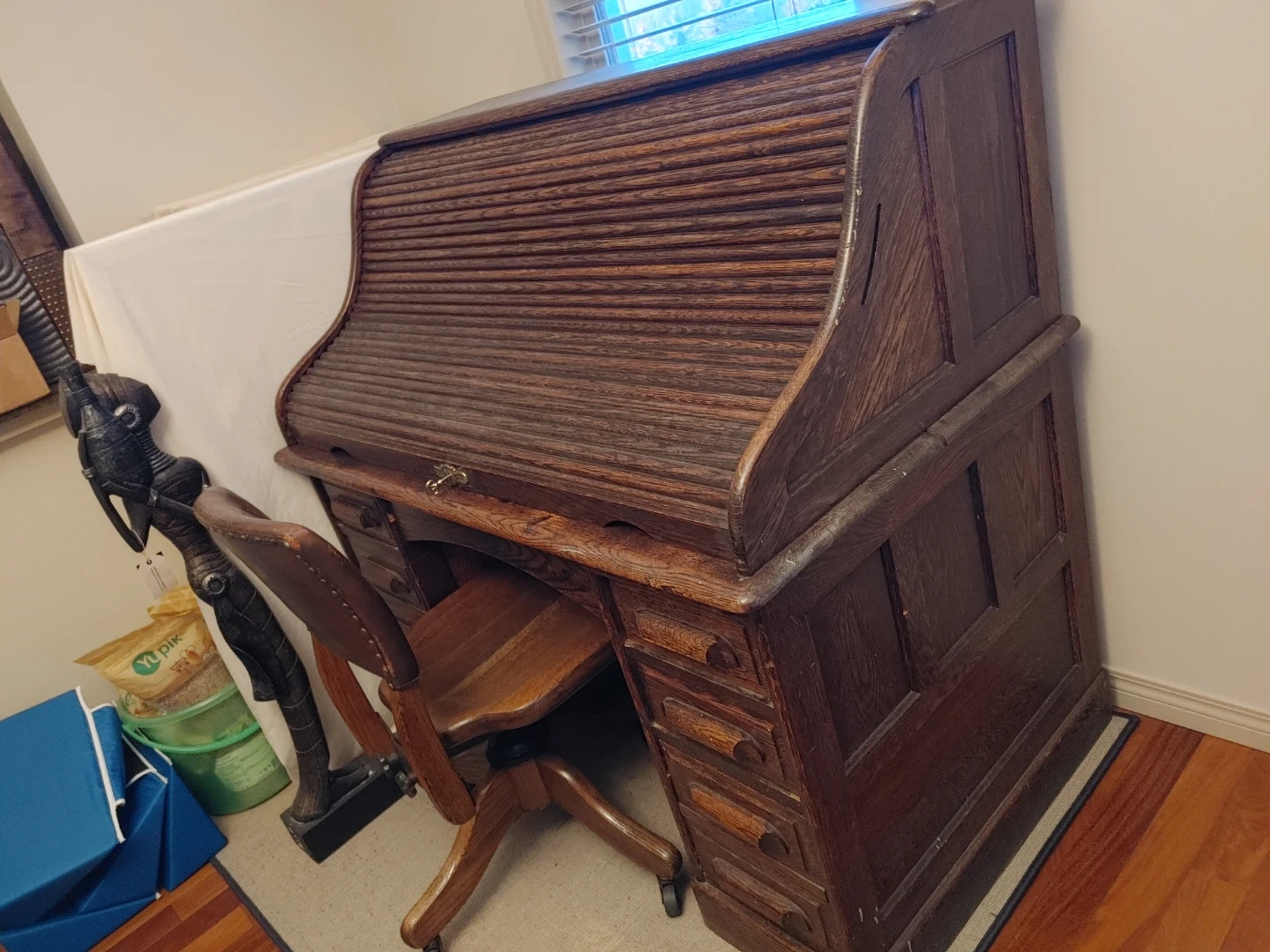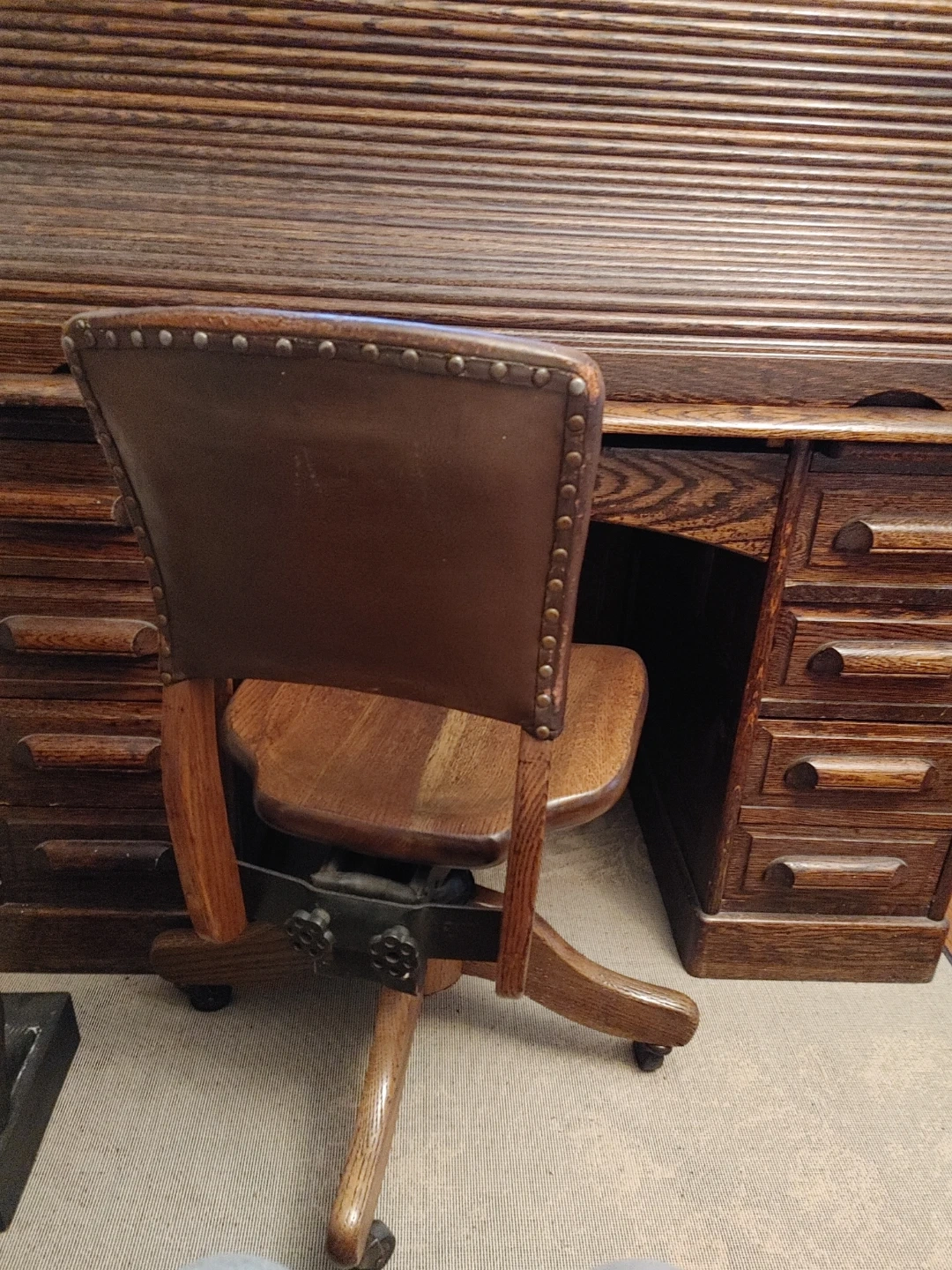 Antique Oak Roll Top Desk with Chair from the 1900s