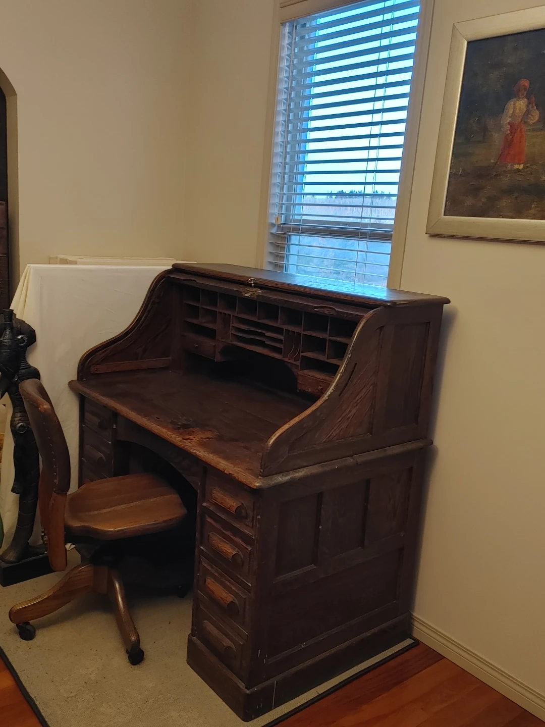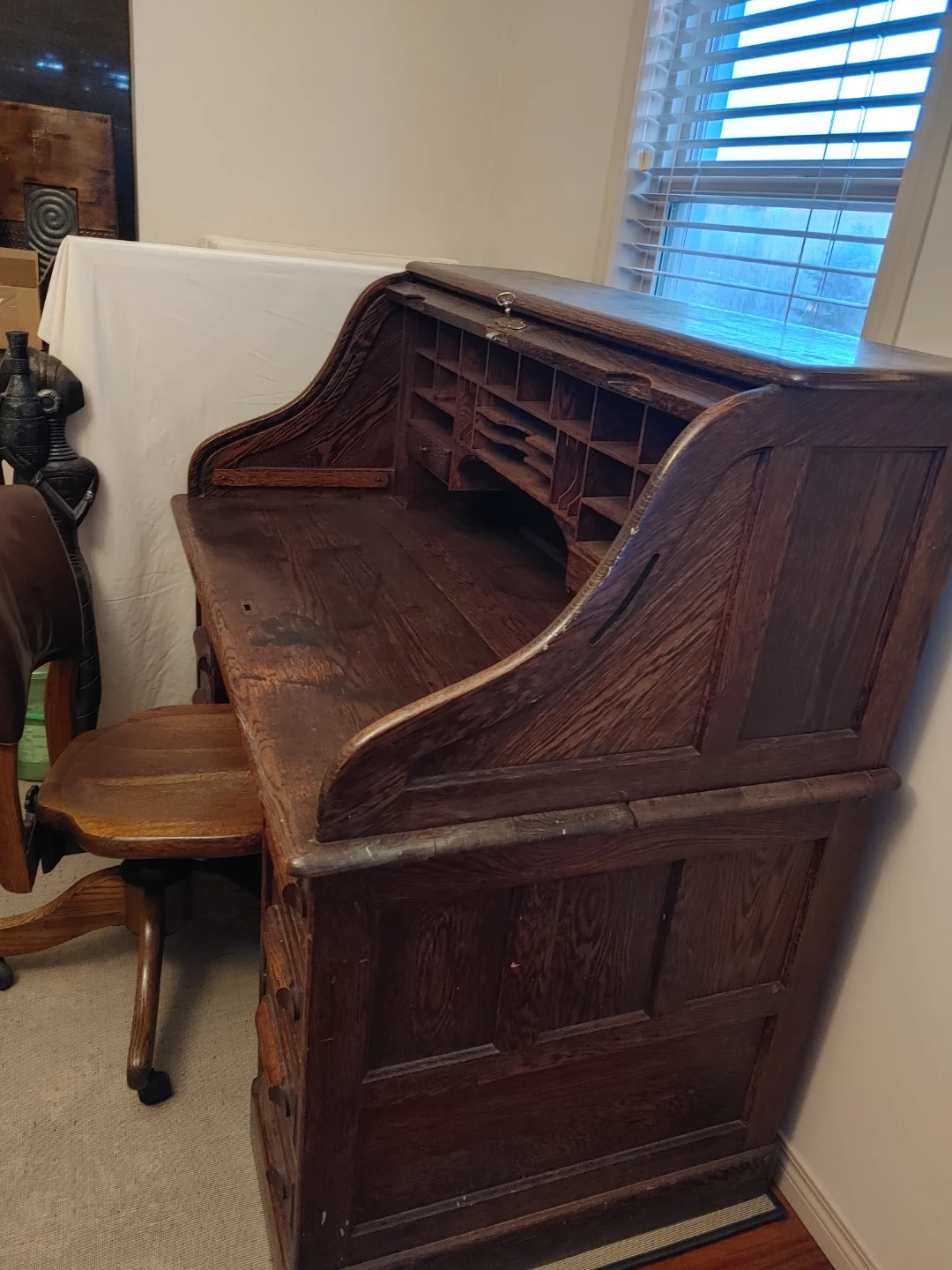 This is a beautiful antique from the 1900s oak roll-top desk, perfect for a home office. It is well preserved and features numerous drawers and cubbies for organization. The set includes a matching wooden chair with a leather seat and backrest. This desk and chair are in excellent shape for a 100 years old piece of art, a statement piece for any workspace!