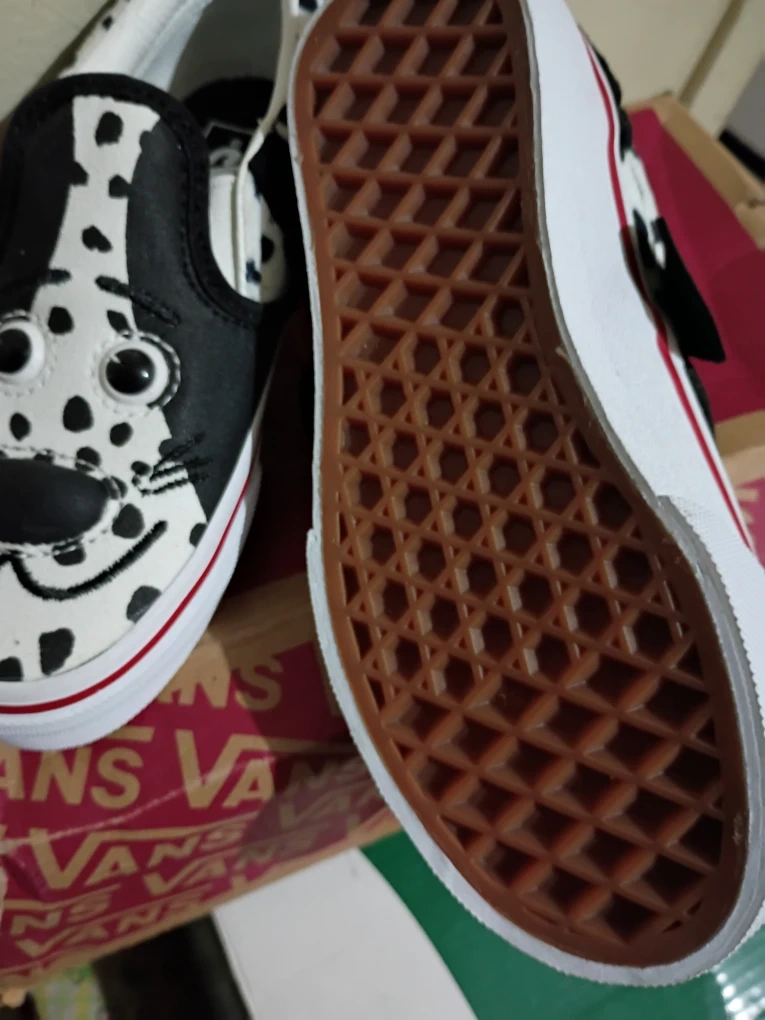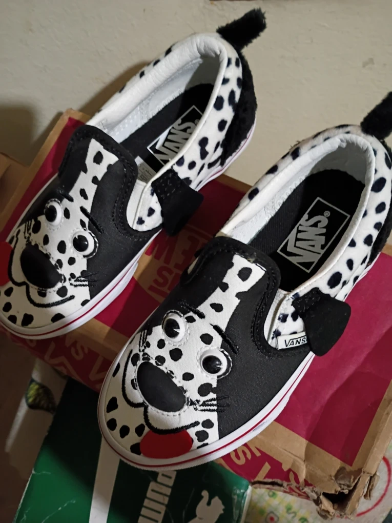 Toddler Vans slip-on shoes featuring a fun Dalmation dog design. Black and white spotted pattern with cute dog face details. Easy slip-on style for little ones!