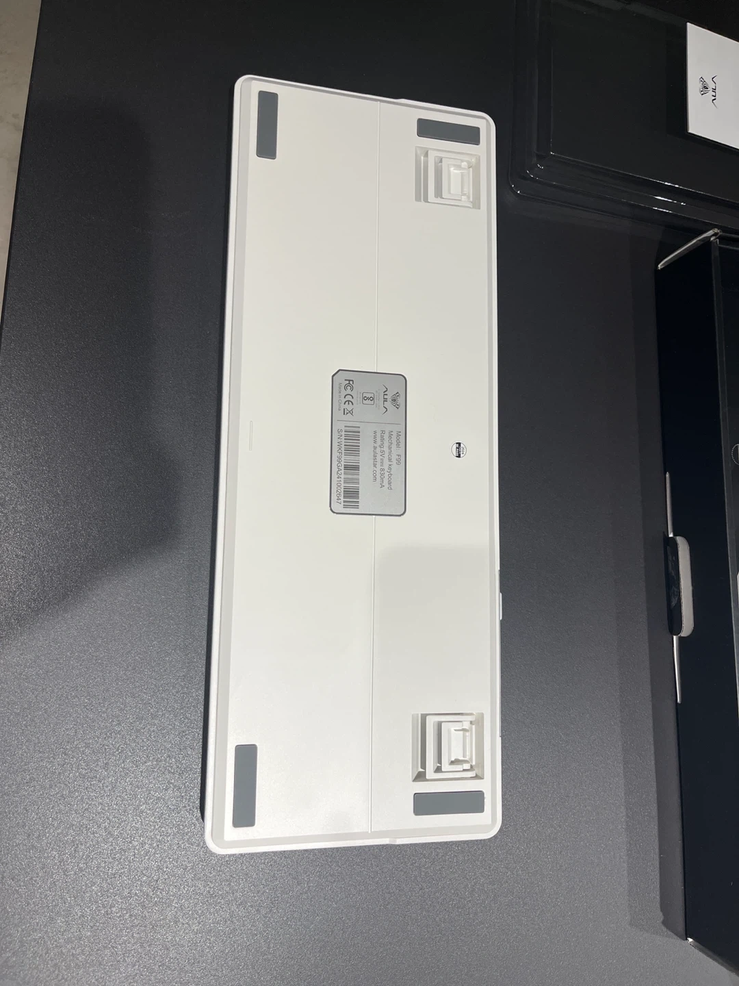 This is a mechanical keyboard from AULA, model F99. It has a gasket structure and cool backlight effects. The keyboard is white and comes with a protective cover and the original box