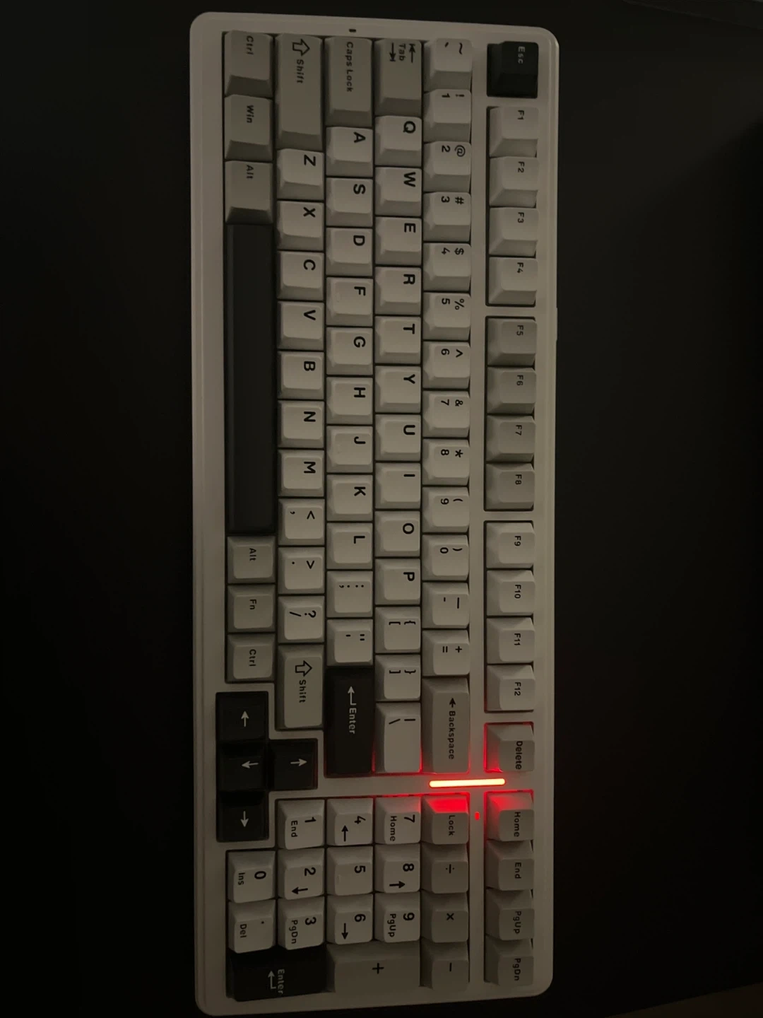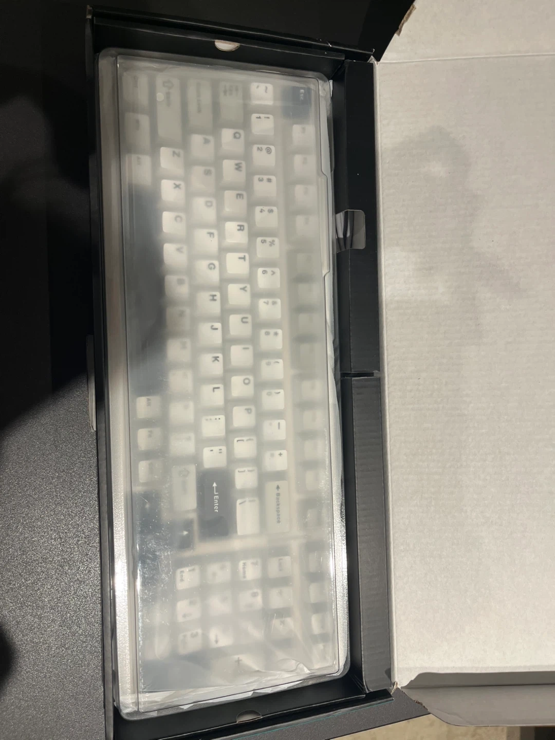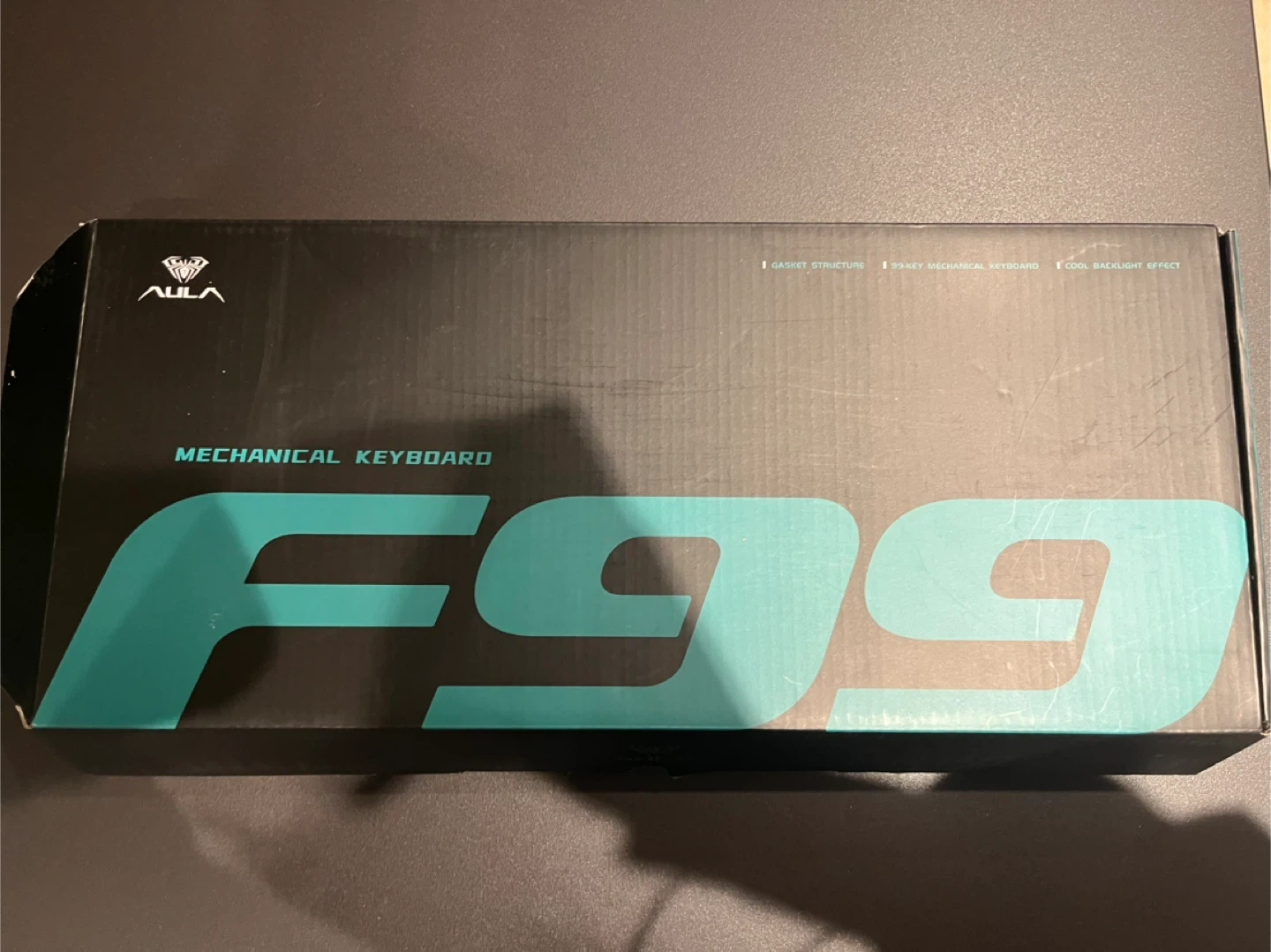 This is a mechanical keyboard from AULA, model F99. It has a gasket structure and cool backlight effects. The keyboard is white and comes with a protective cover and the original box