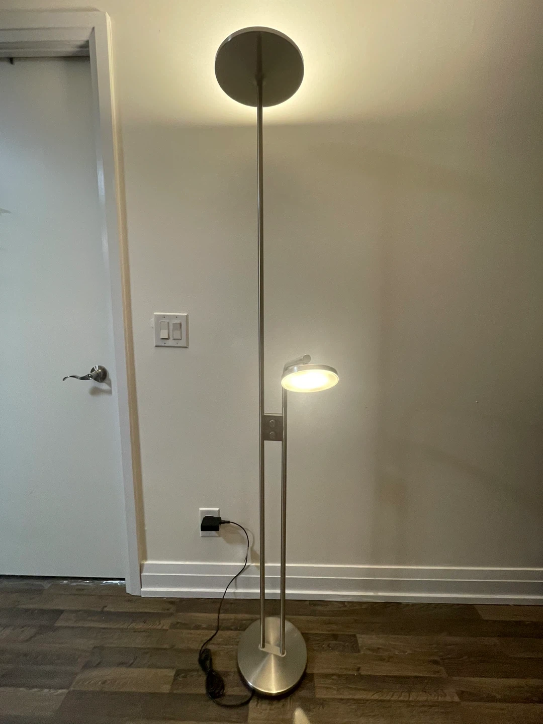 A sleek brushed nickel floor lamp with a second adjustable reading light. It offers two distinct light sources for versatile illumination. This lamp provides both ambient and task lighting, perfect for a stylish living room or bedroom.