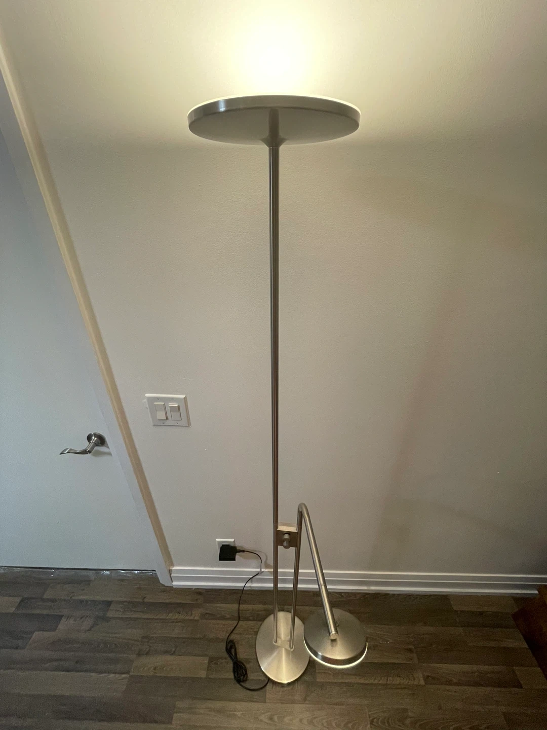 A sleek brushed nickel floor lamp with a second adjustable reading light. It offers two distinct light sources for versatile illumination. This lamp provides both ambient and task lighting, perfect for a stylish living room or bedroom.