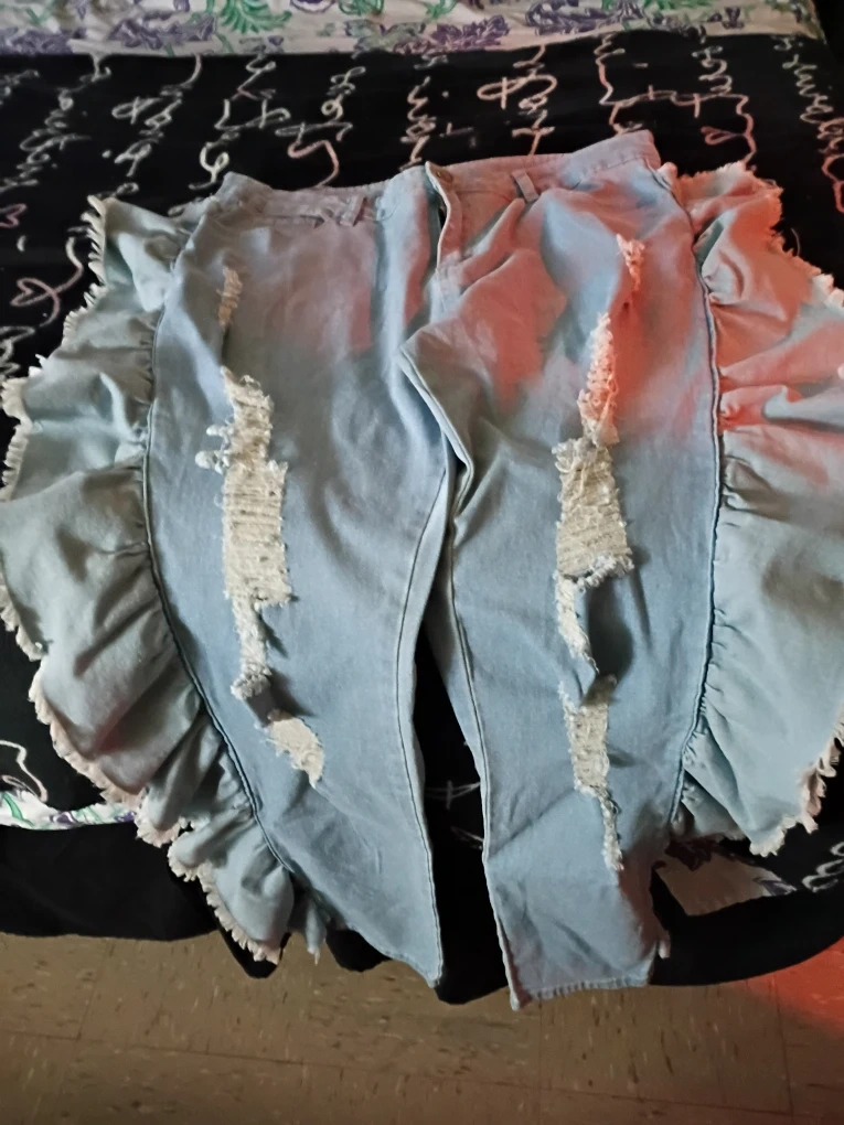 These light wash denim jeans feature a distressed, ripped design with added ruffle trim on the sides. They have a casual, trendy look. Made of denim material.