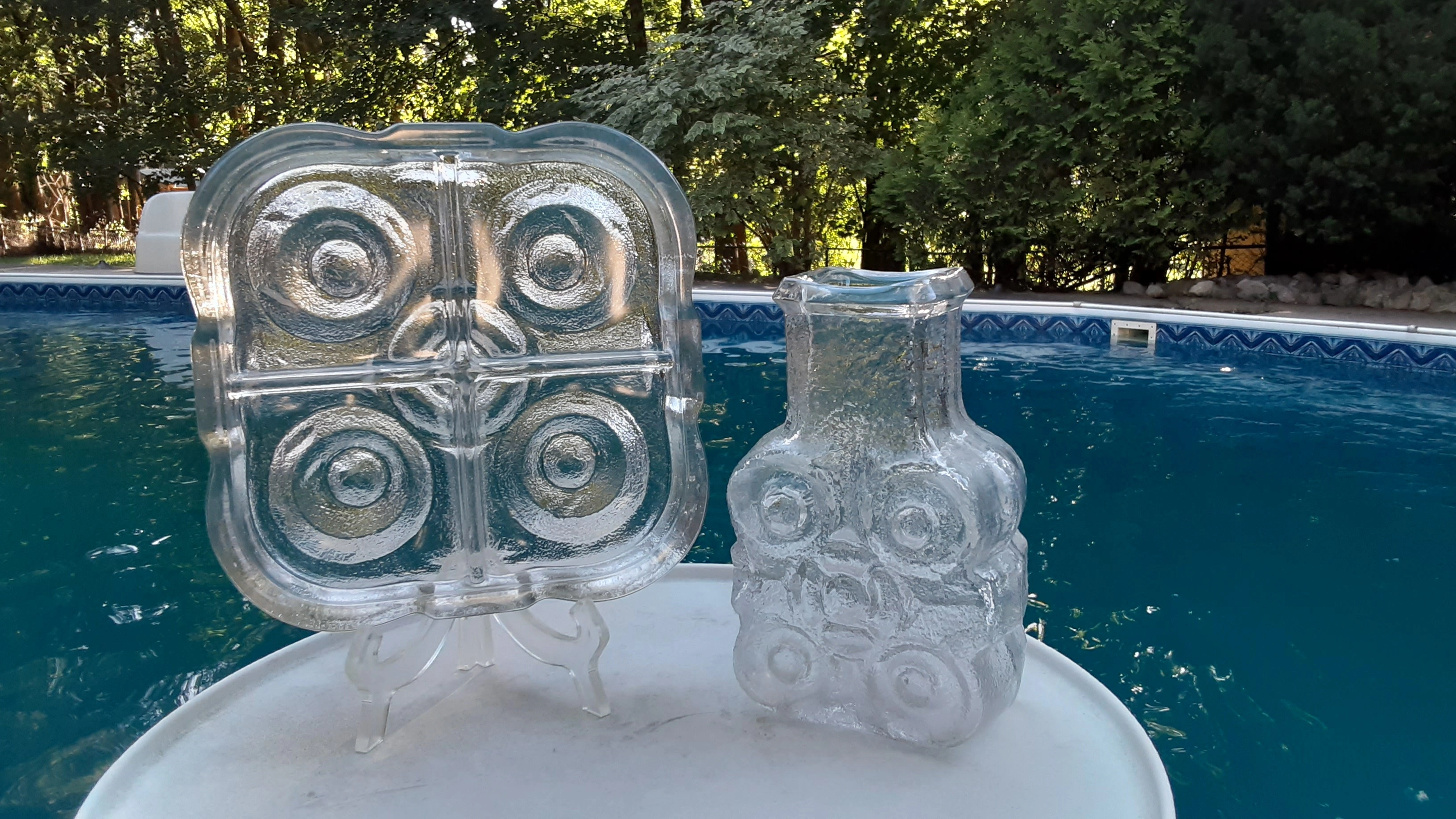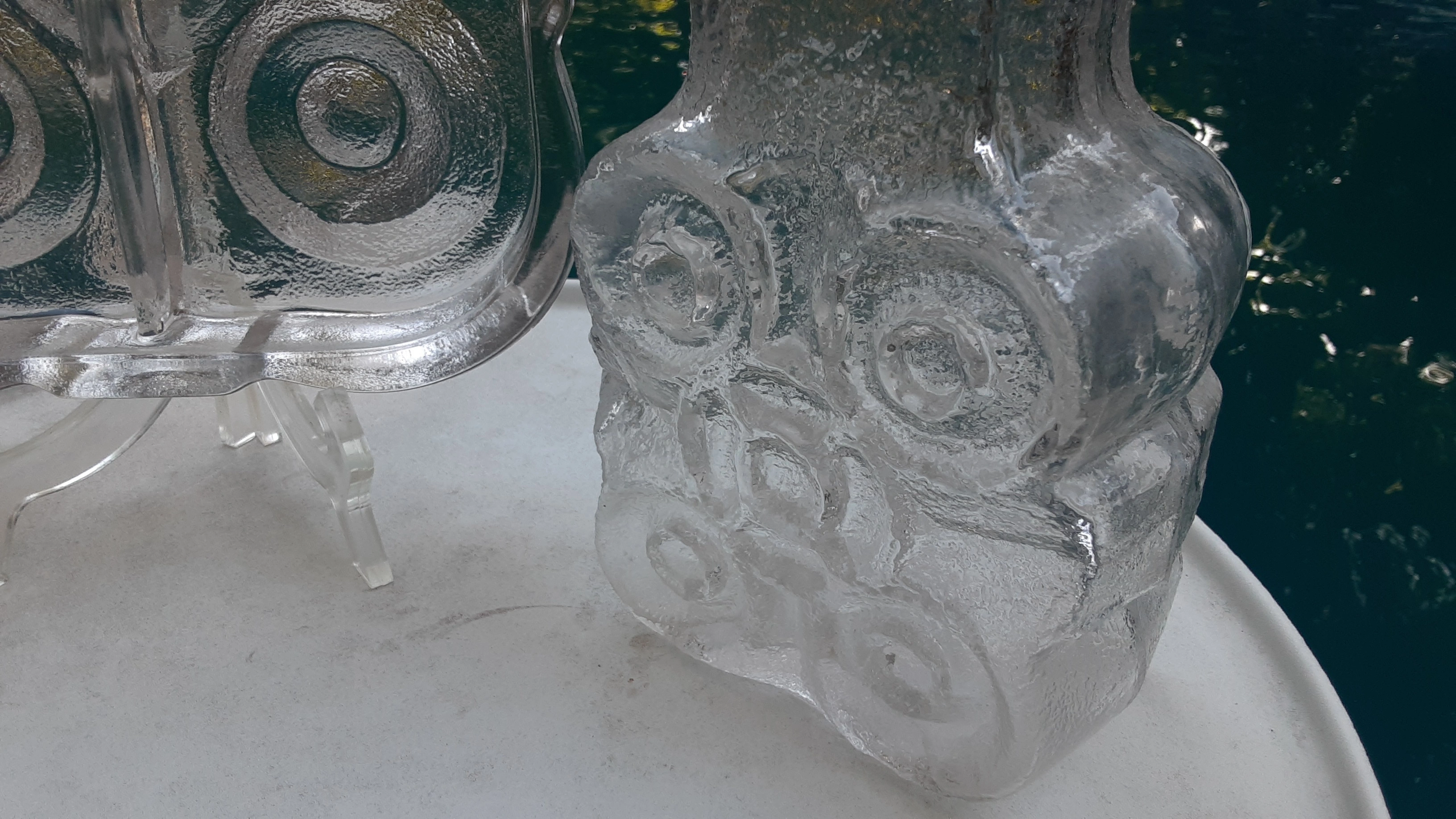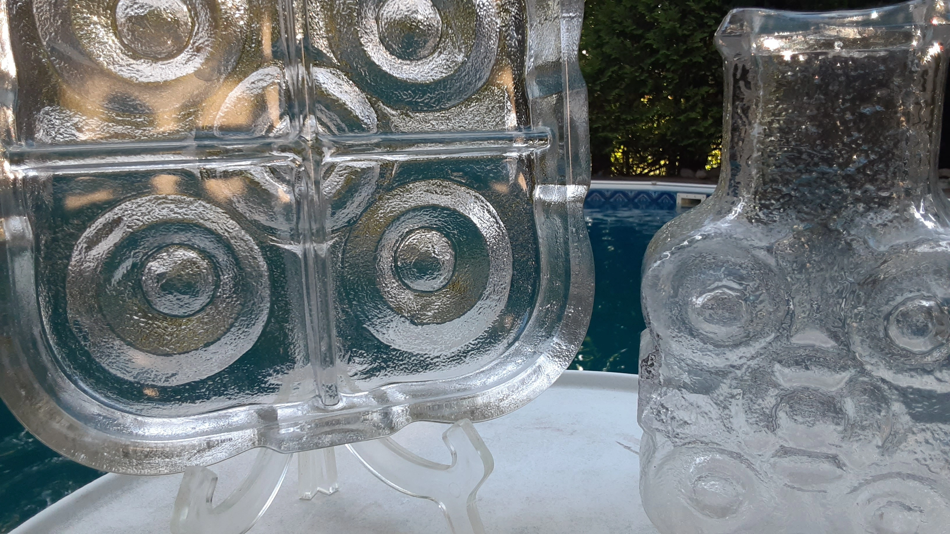 Hey there vintage collectors! We've got a real treat for you - a breathtakingly beautiful art glass set from the 1970s designed by none other than Lars Hellsten for Walther Glas Design. Entitled "On the Rocks" this set includes a heavy and thick divided dish and a flower vase, both of which are true works of art beyond just their function. The mid-century, brutalist design is a testament to Hellsten's prowess as a designer, and his work with Orrefors and Skruf Sweden is widely known and admired.