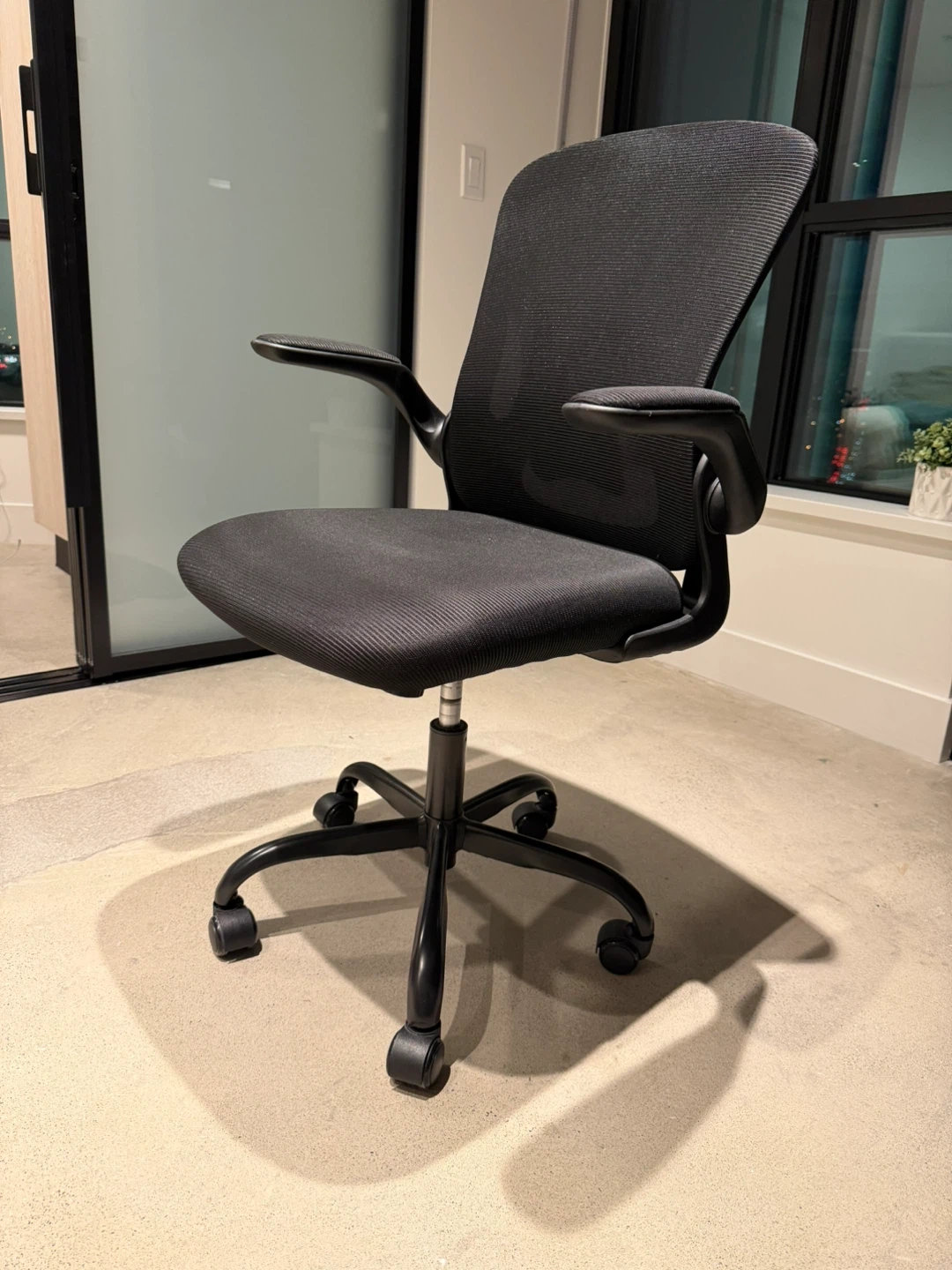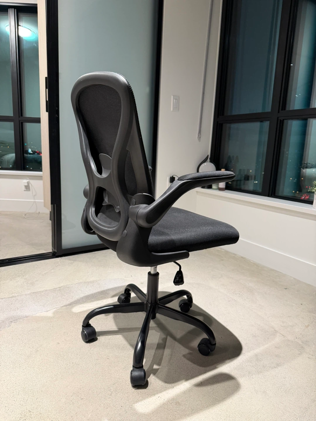 This black ergonomic mesh office chair features breathable material and adjustable arms. Seat height is adjustable to suit your needs. It's great for long hours at a desk!
