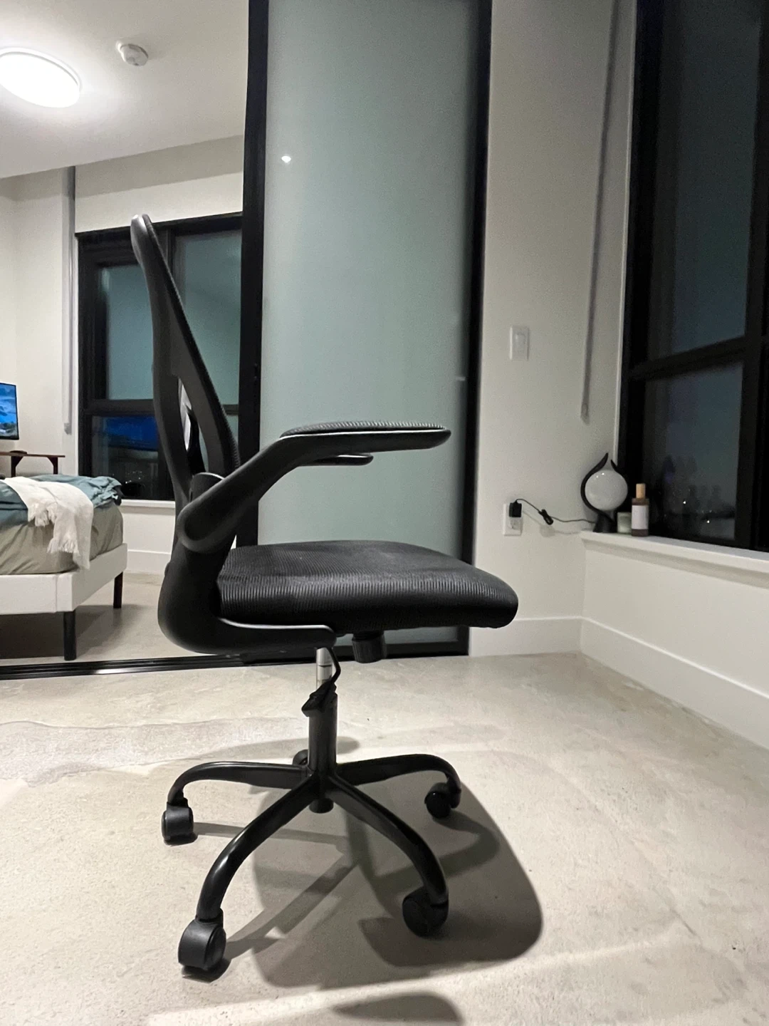 This black ergonomic mesh office chair features breathable material and adjustable arms. Seat height is adjustable to suit your needs. It's great for long hours at a desk!