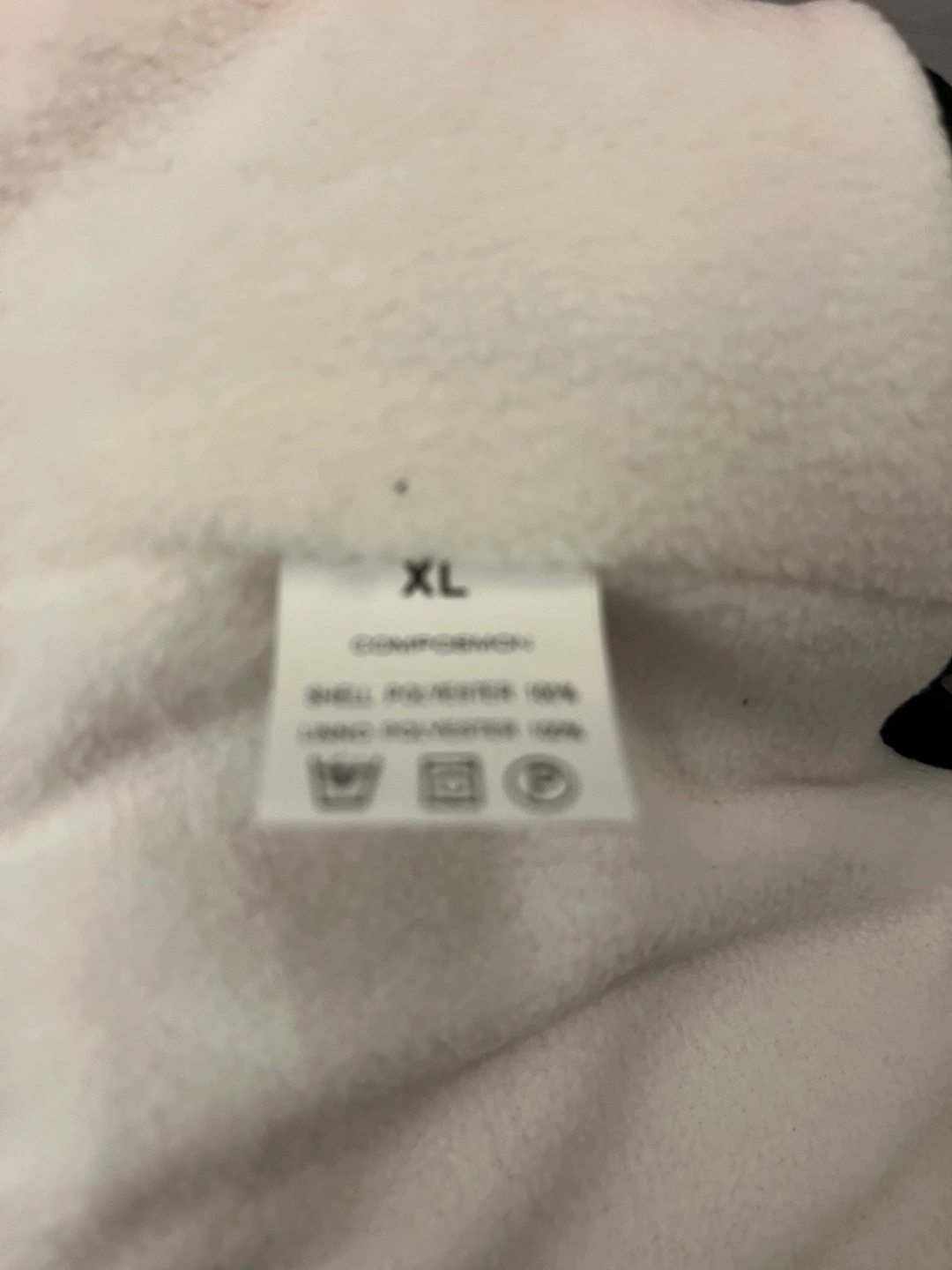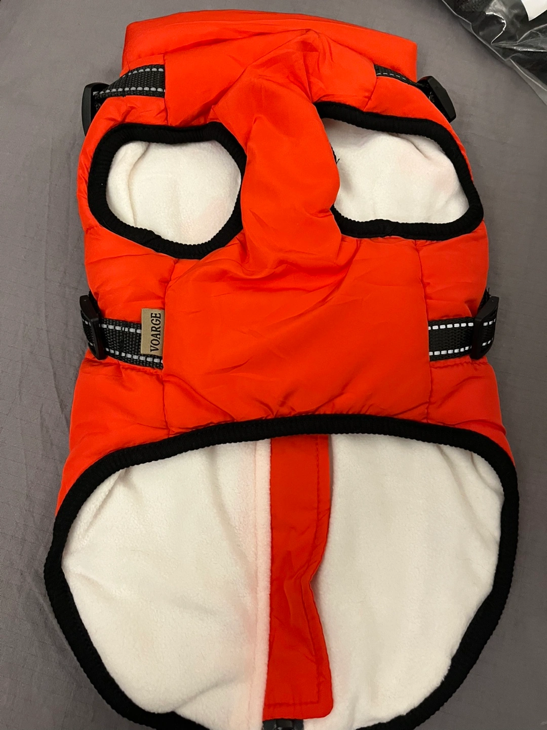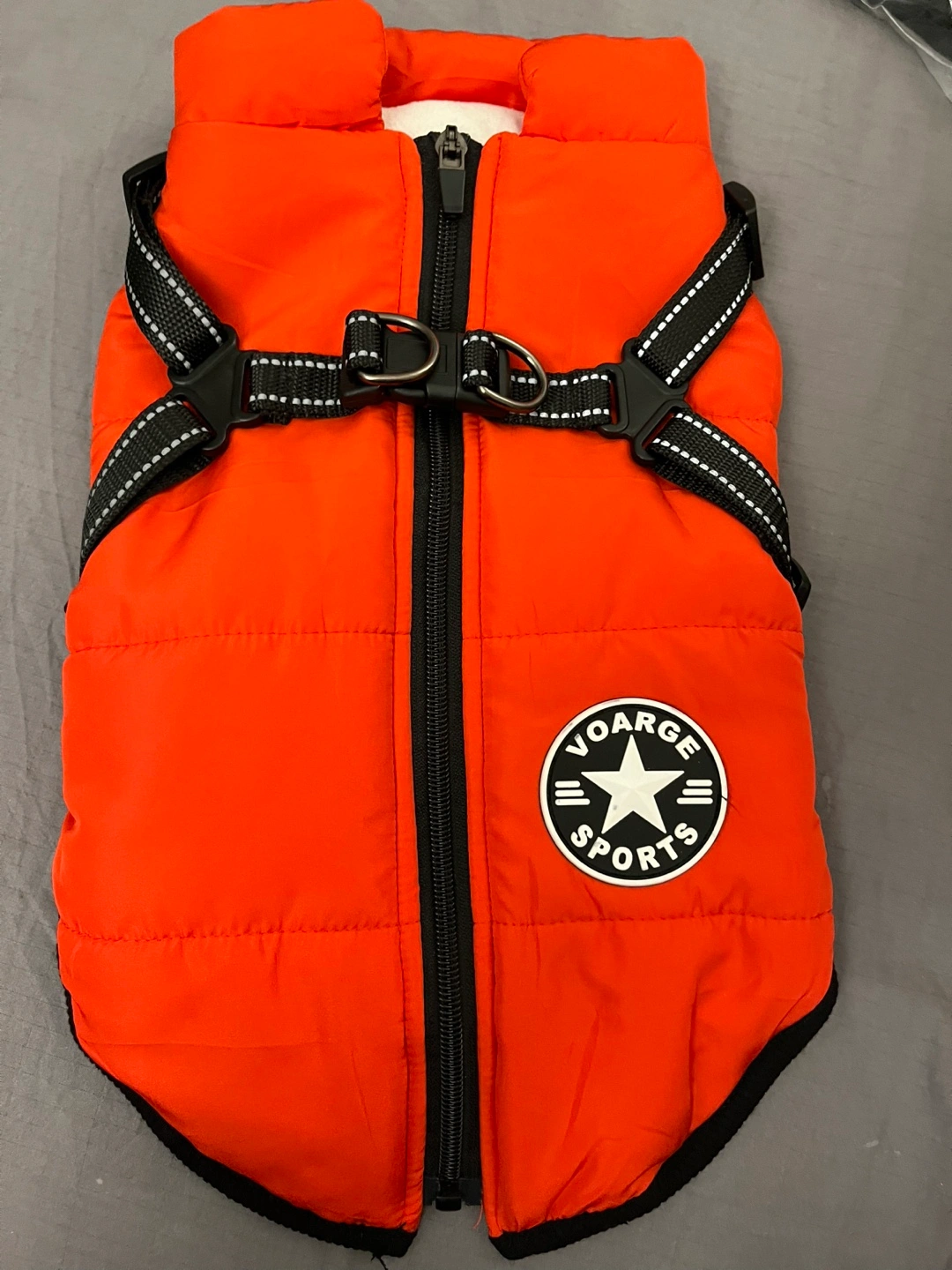 This is an orange Voarge Sports dog winter coat. It's a size XL with a fleece lining. The shell is polyester and the lining is fleece.