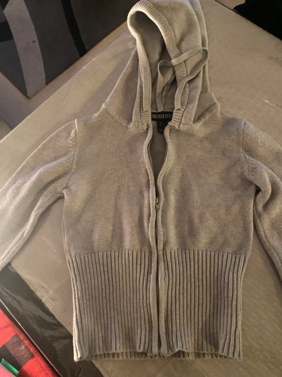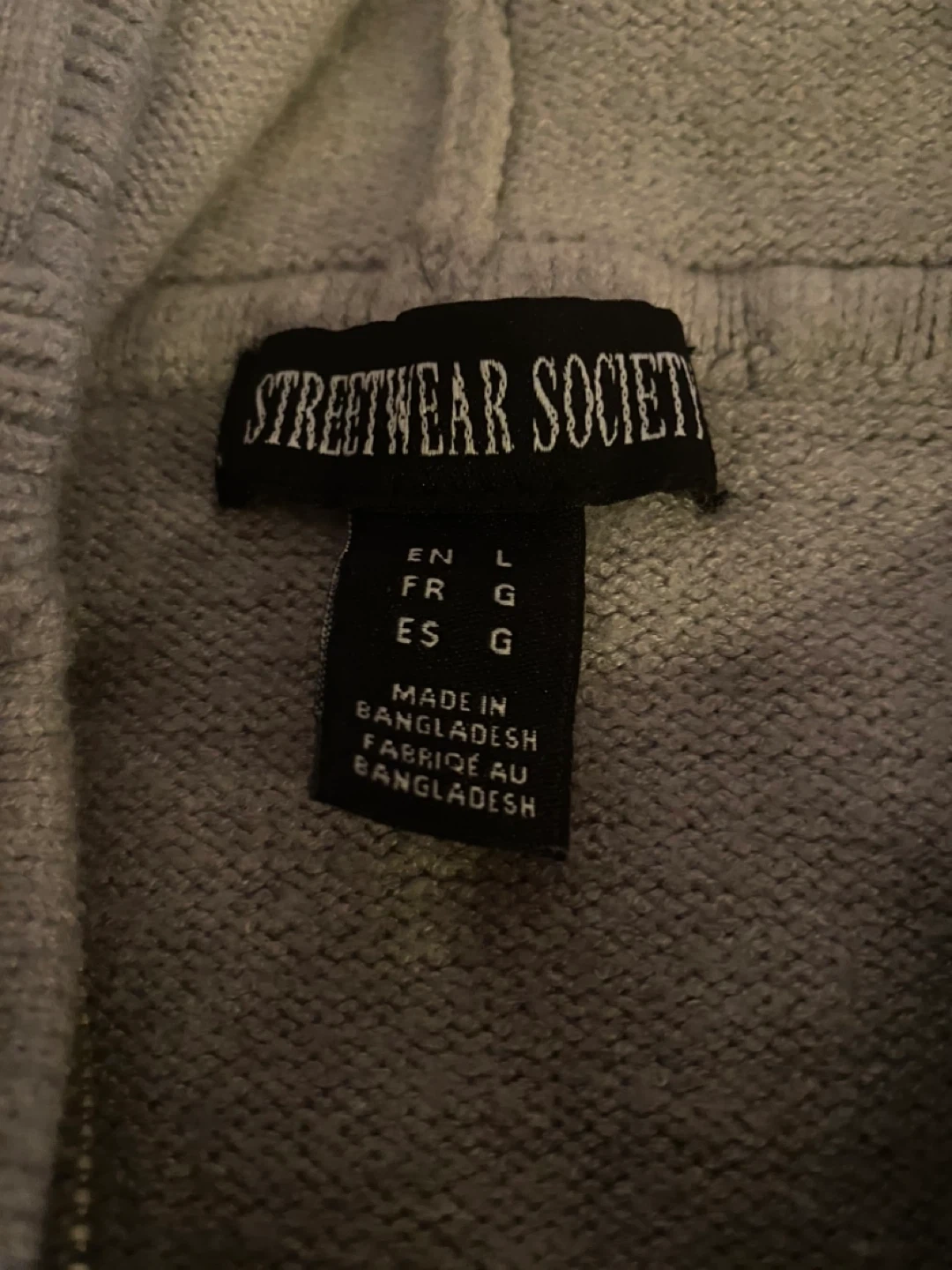 Streetwear Society knit zip-up hoodie in a neutral grey colour. It features a full zip closure and a cozy hood. This sweater is size L.