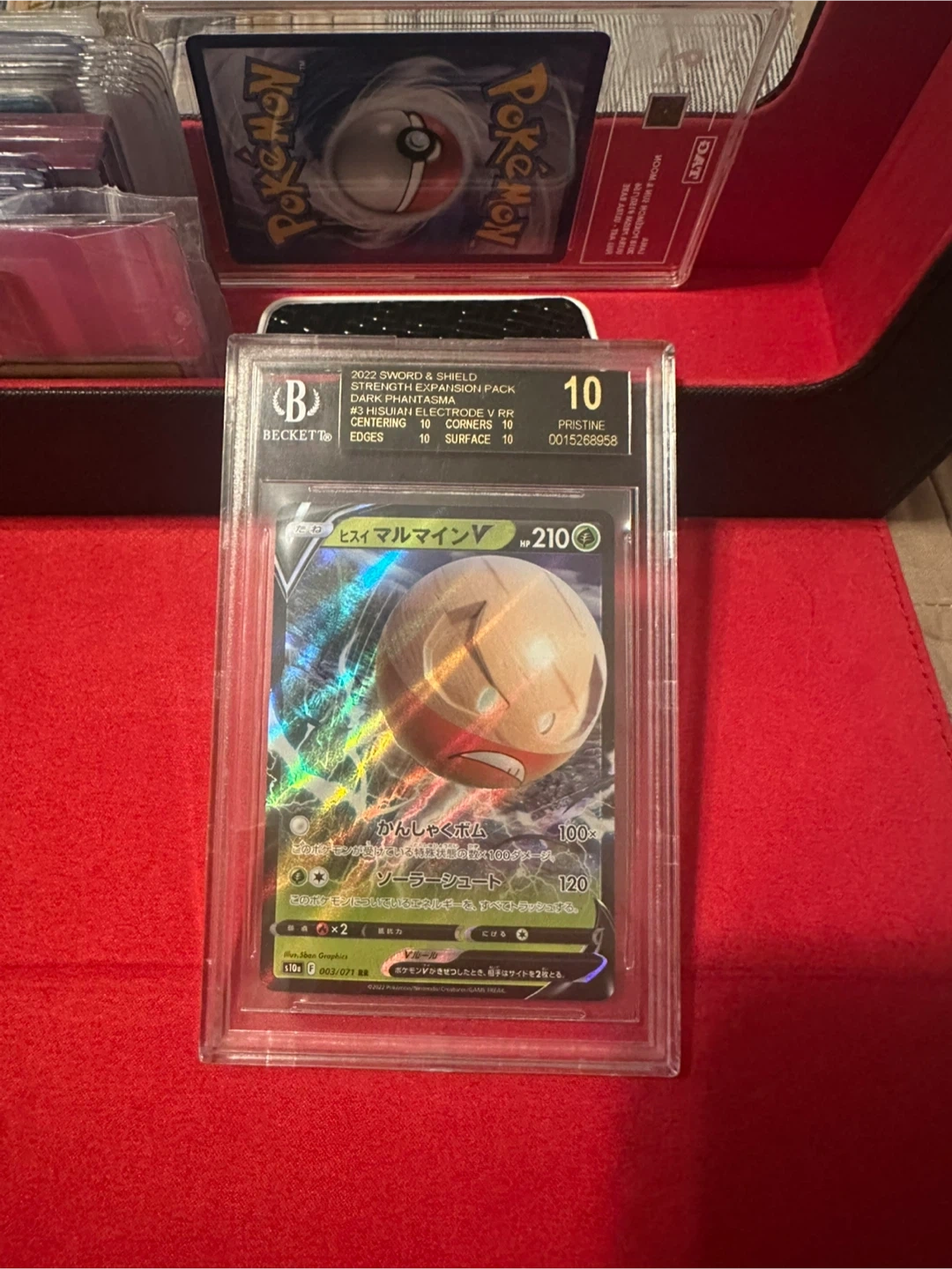 This is a graded Pokemon TCG card featuring Hisuian Electrode V RR. It's a Grade 10 from Beckett Grading Services. The card is from the Sword & Shield series. It's a great addition for any collector!