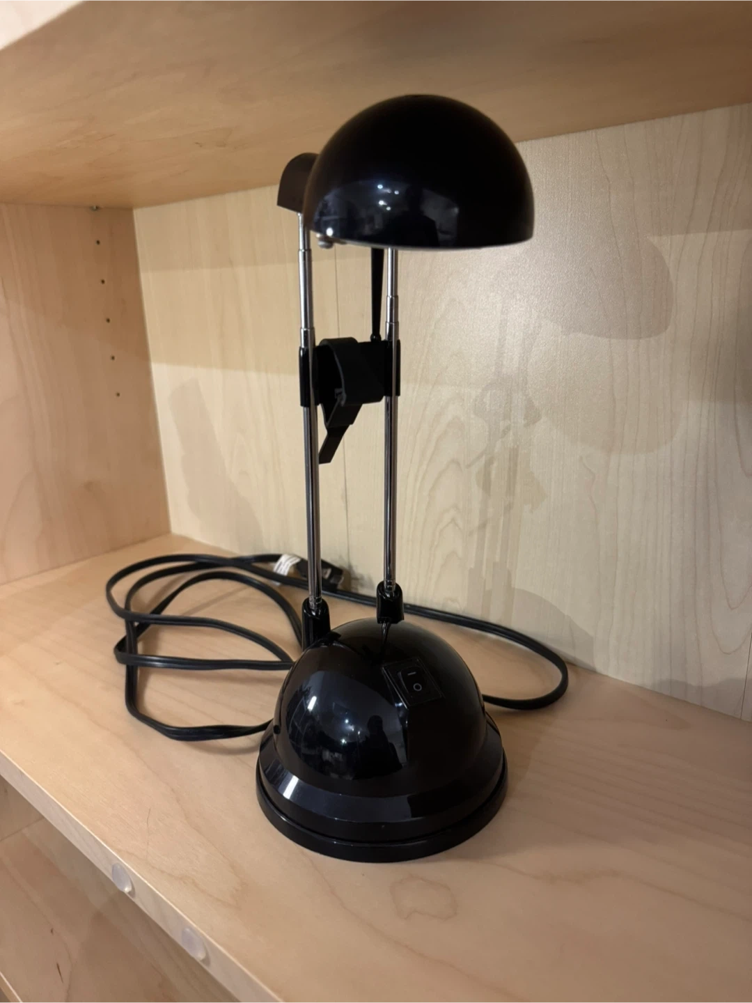 This is a black adjustable desk lamp. It's made of plastic and metal. It has a flexible gooseneck arm for positioning the light where you need it. It's great for tasks requiring focused light.