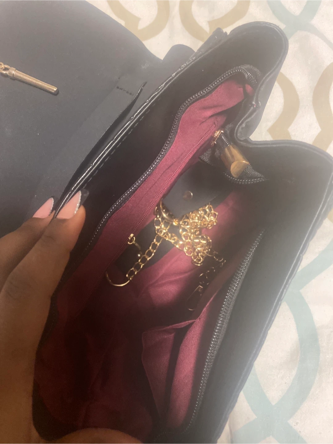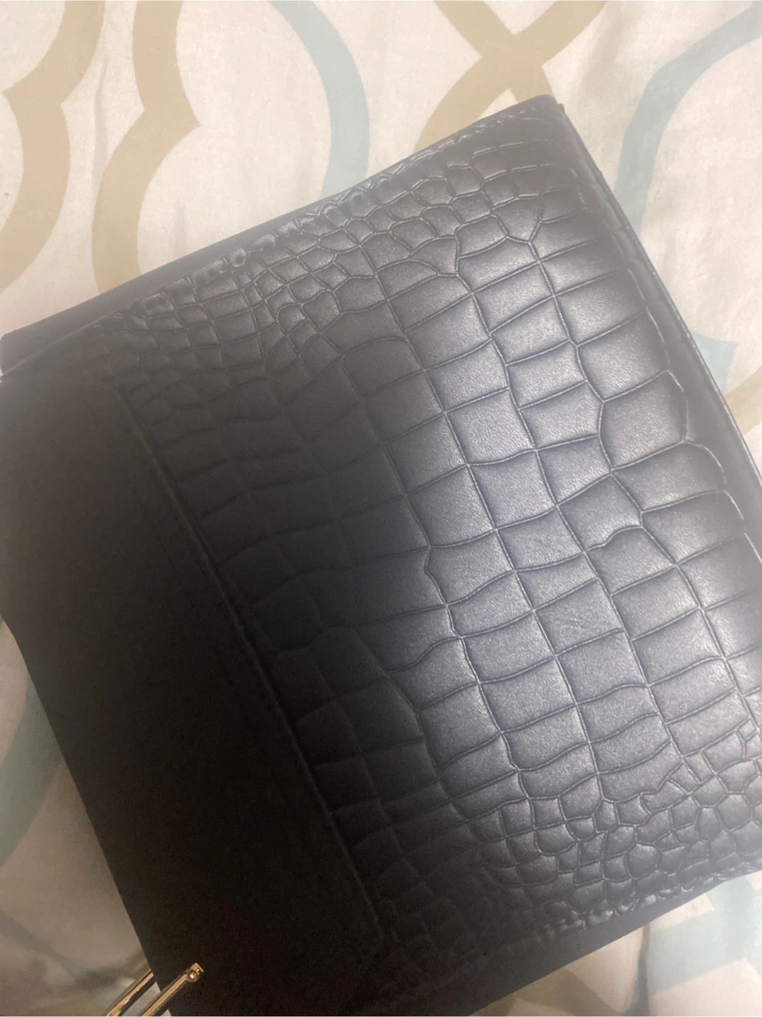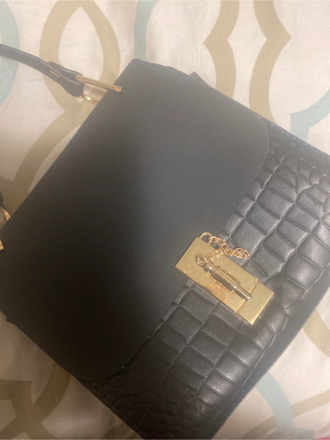 Stylish black handbag with a croc-embossed front panel and a secure gold-tone clasp closure. It features a spacious interior with a zippered pocket and a sleek burgundy lining. A detachable gold chain strap is included for versatile carrying options.