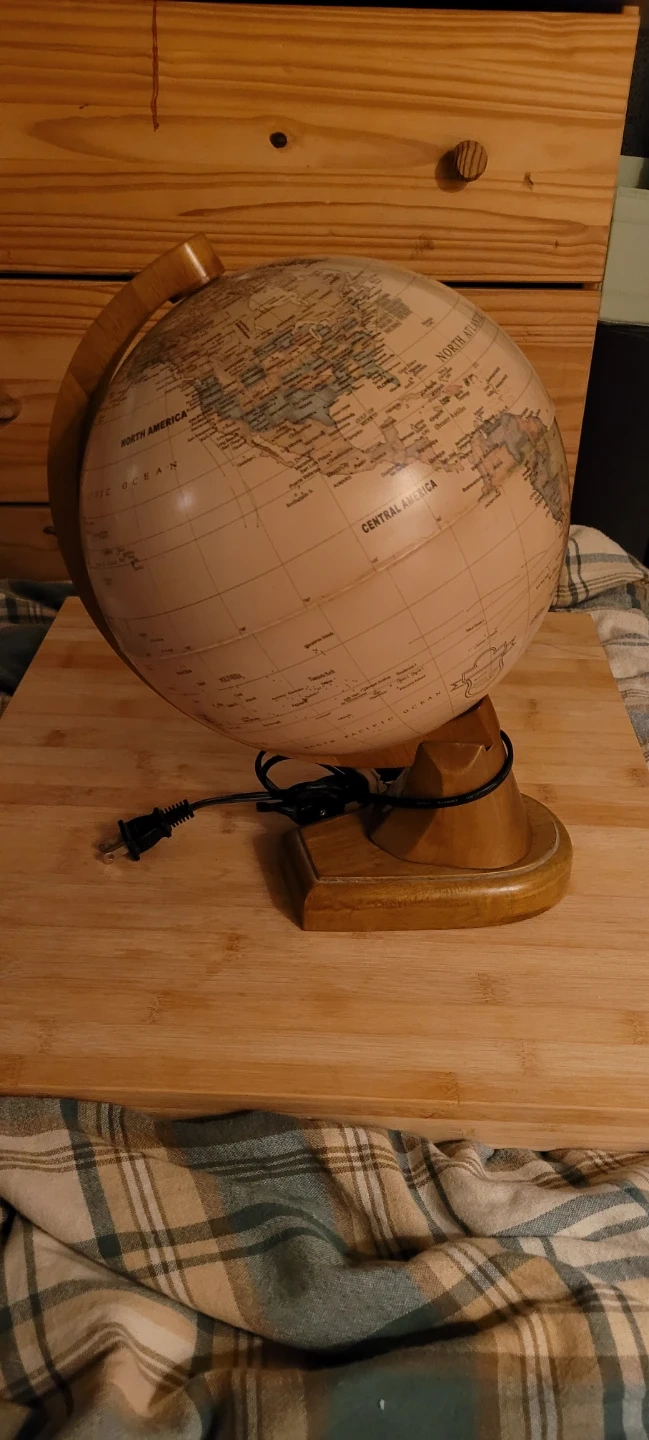 This is a vintage illuminated globe. It's mounted on a wooden base and includes a power cord for illumination. It shows North America, the Pacific Ocean, Central America, and more.
