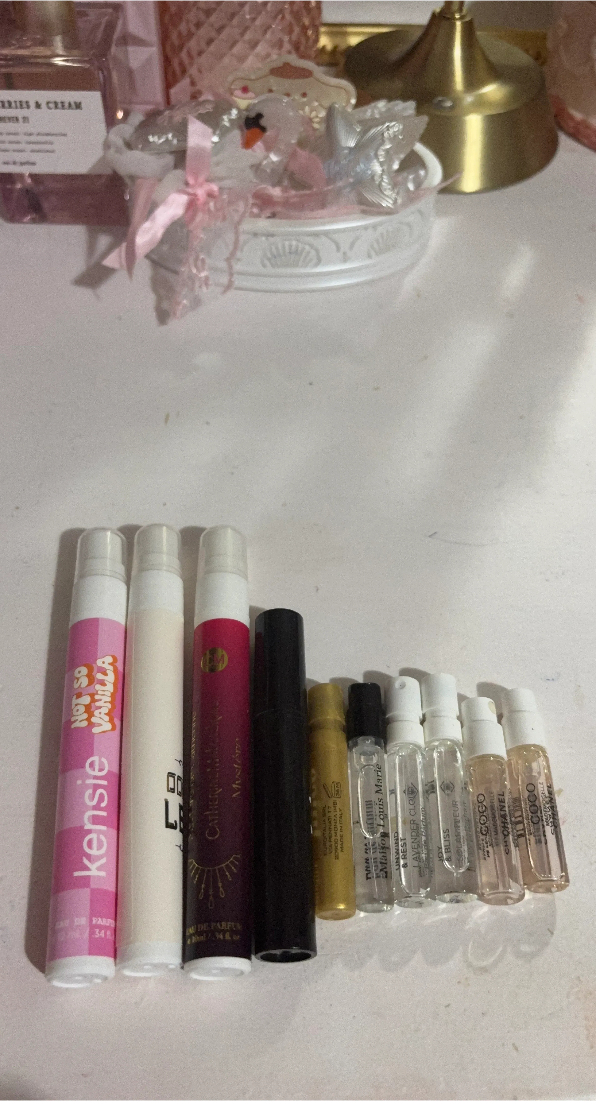 A collection of perfume samplers including -Kensie Not So Vanilla