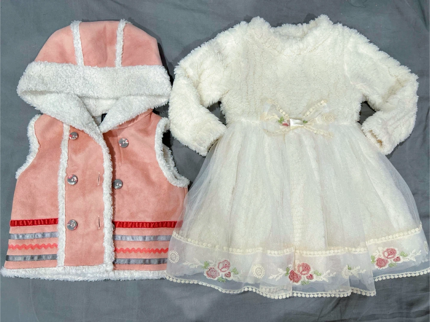 New white dress and Pink Hooded Vest. Perfect for keeping your little one warm and stylish!