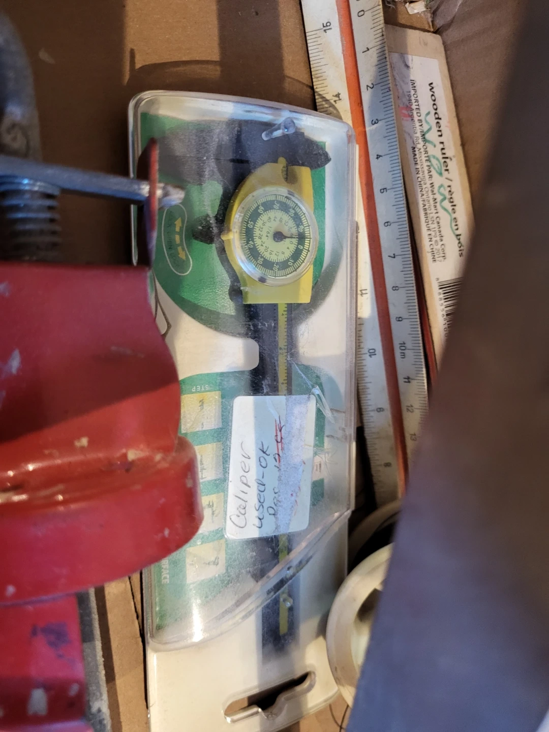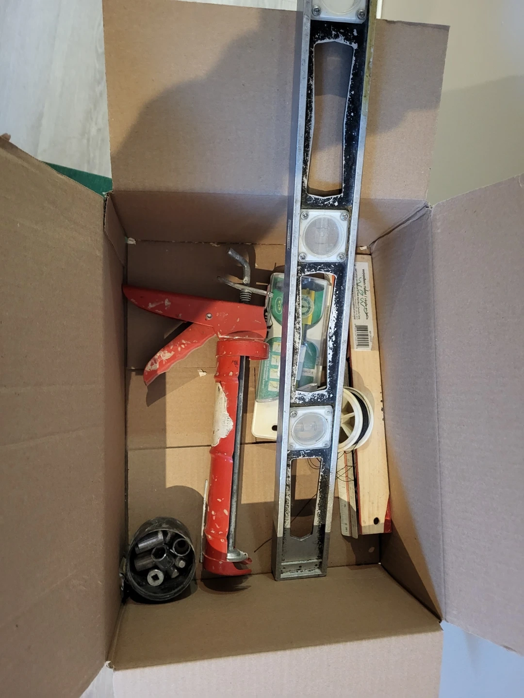 A collection of assorted tools including a spirit level, calipers, and a caulking gun. Also includes various rulers and some small hardware pieces. Good for general DIY projects. level is not in perfect condition.
