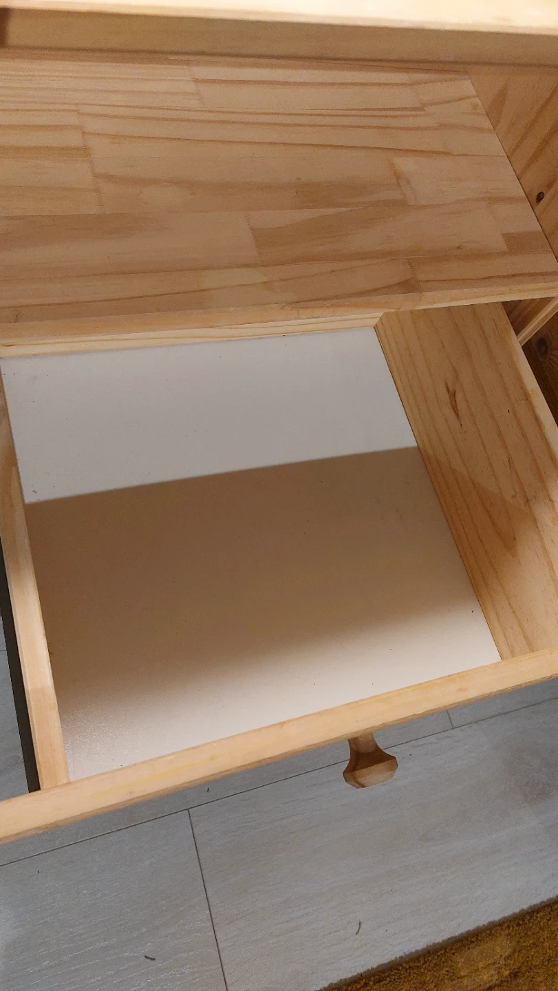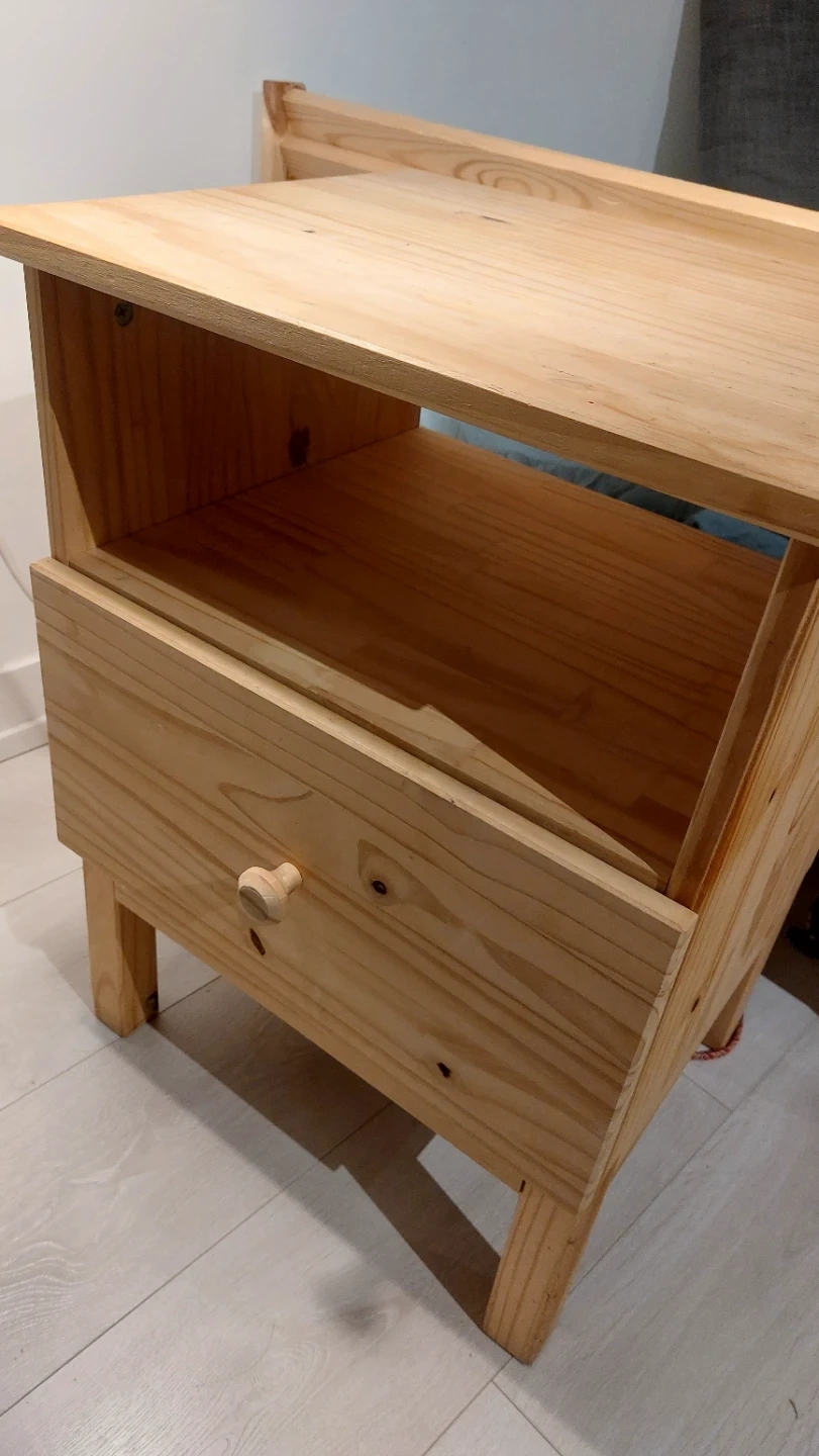 This pine wood ikea nightstand features a drawer and an open shelf. It's made of solid wood. This piece is handy for keeping bedside items organized.