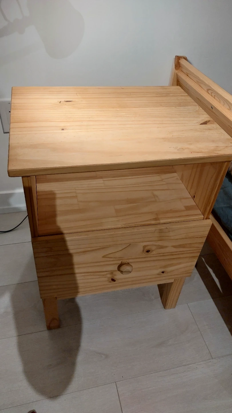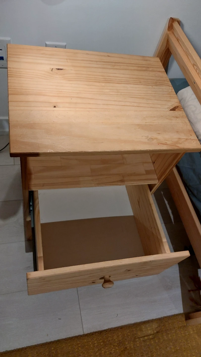 This pine wood ikea nightstand features a drawer and an open shelf. It's made of solid wood. This piece is handy for keeping bedside items organized.