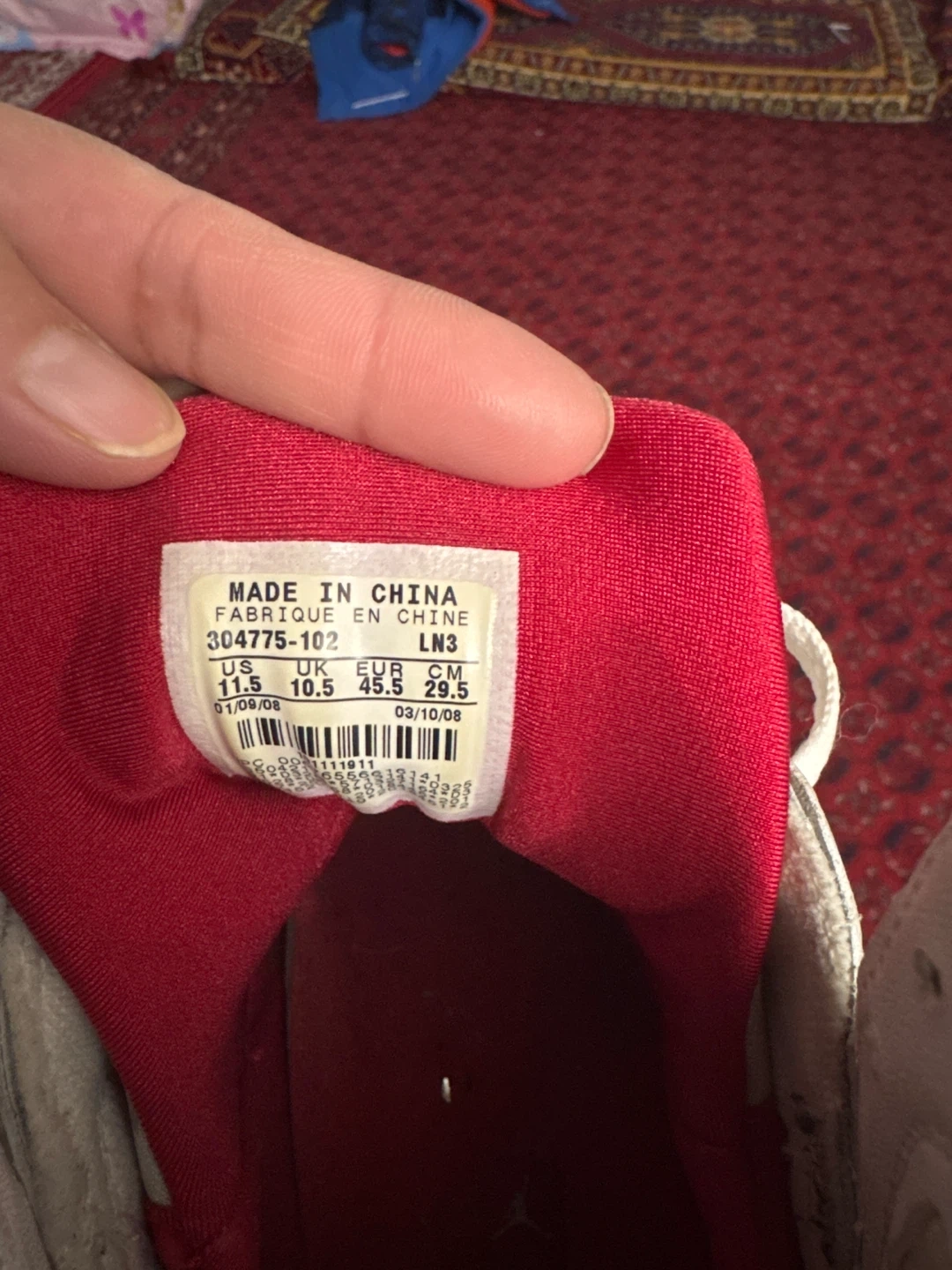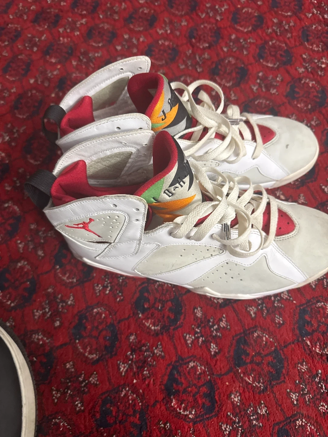 These Air Jordan 7 Retro shoes are a US size 11.5. They're primarily white with red accents and colourful detailing on the tongue. Made in China.