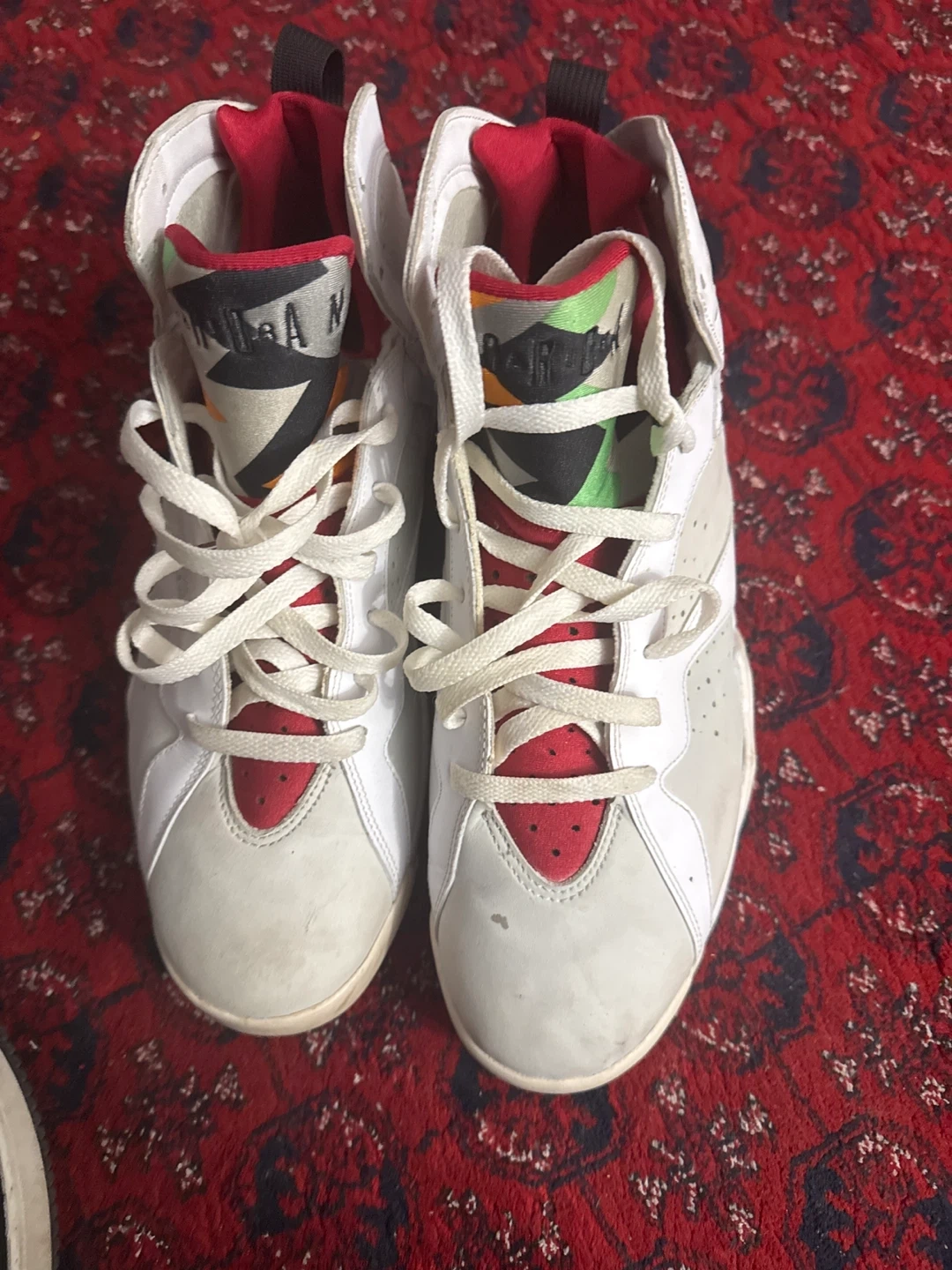 These Air Jordan 7 Retro shoes are a US size 11.5. They're primarily white with red accents and colourful detailing on the tongue. Made in China.