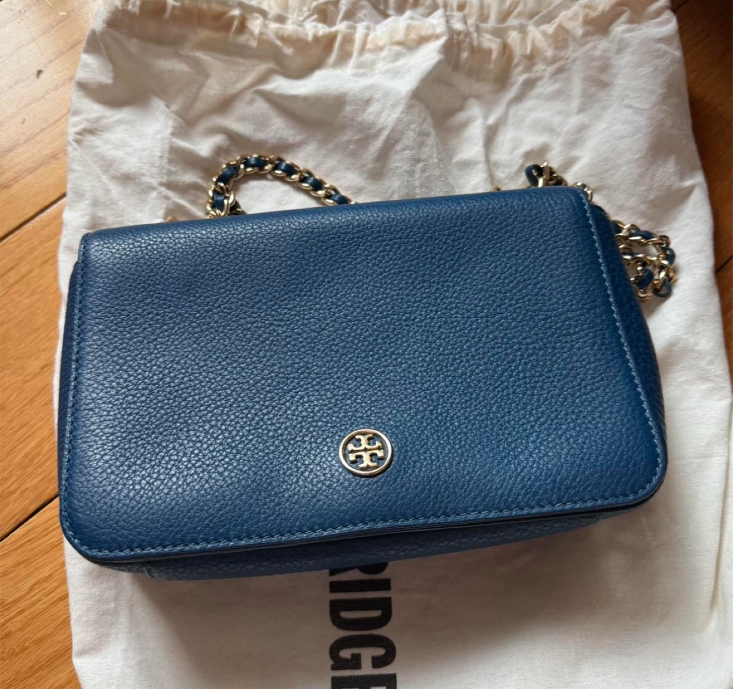Beautiful Tory Burch wallet in a deep blue pebbled leather. It features the iconic Tory Burch logo and a gold chain strap. Leather material.