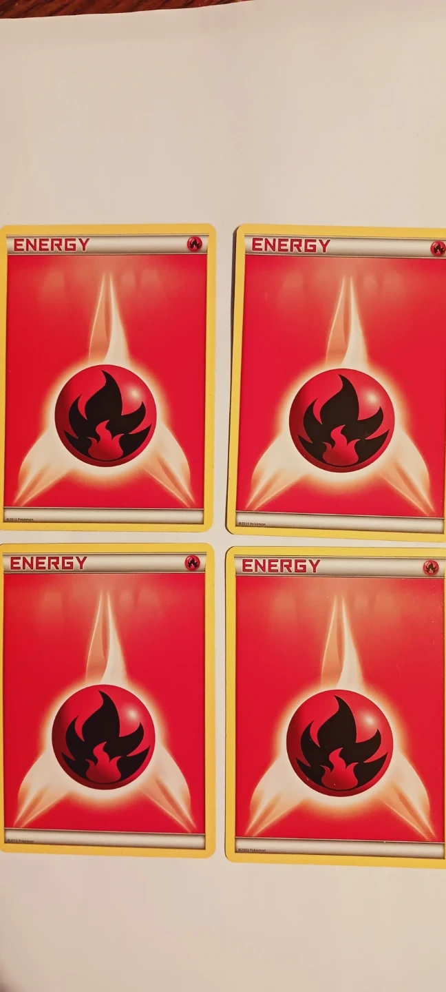 Four Pokemon Fire Energy cards are included. These are standard size trading cards. They're perfect for building your Pokemon deck!