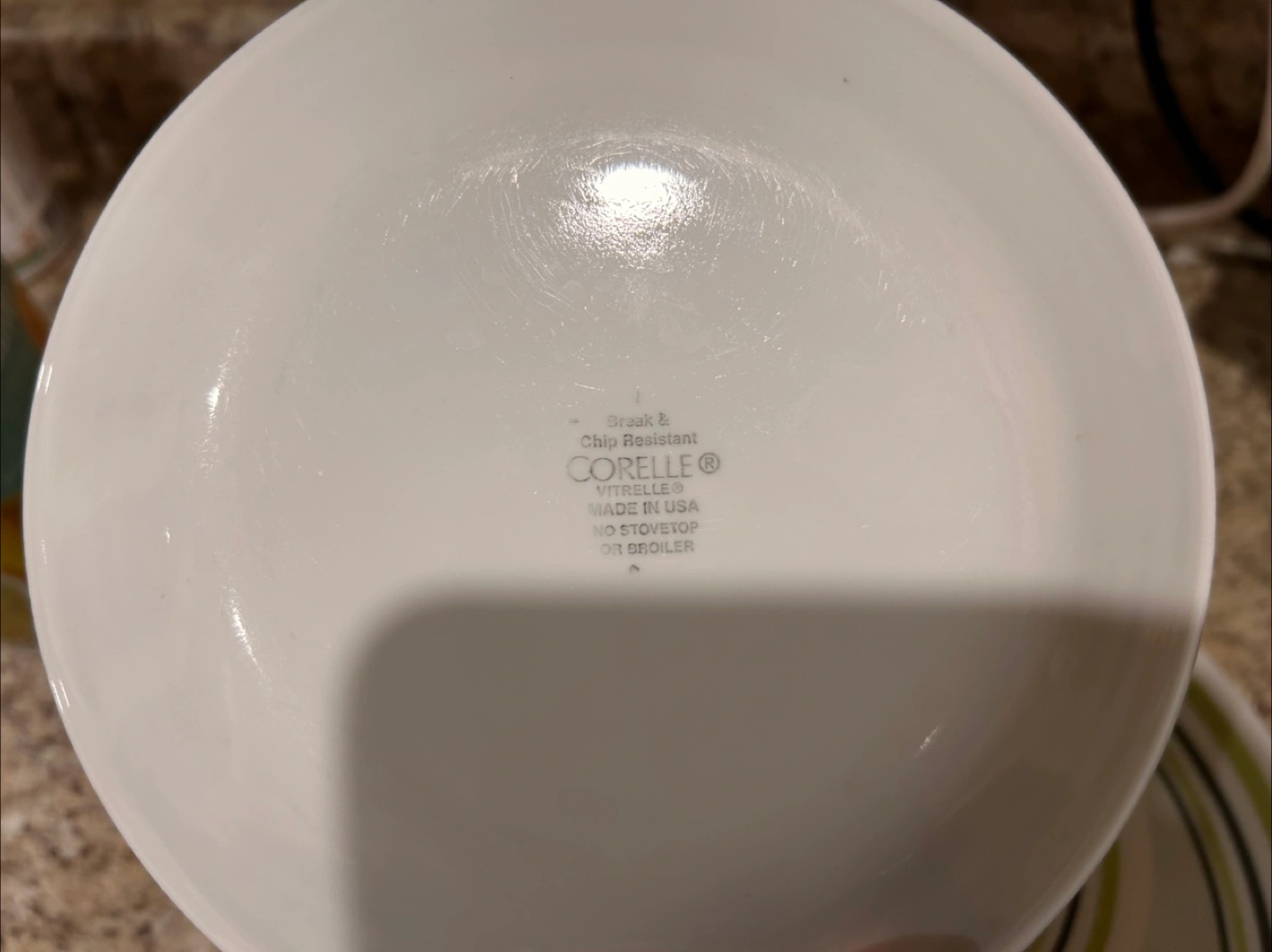 Set of Corelle dinner plates. Break & chip resistant Vitrelle material. Made in USA. These plates have a classic white base with green and black striped detailing.